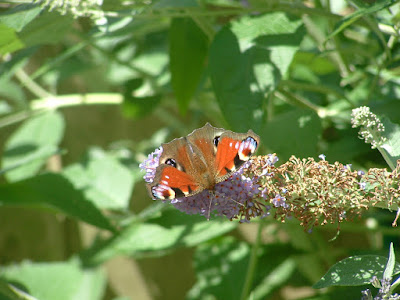 A peacock butterfly; I started seeing them more often after I planted my buddleia.