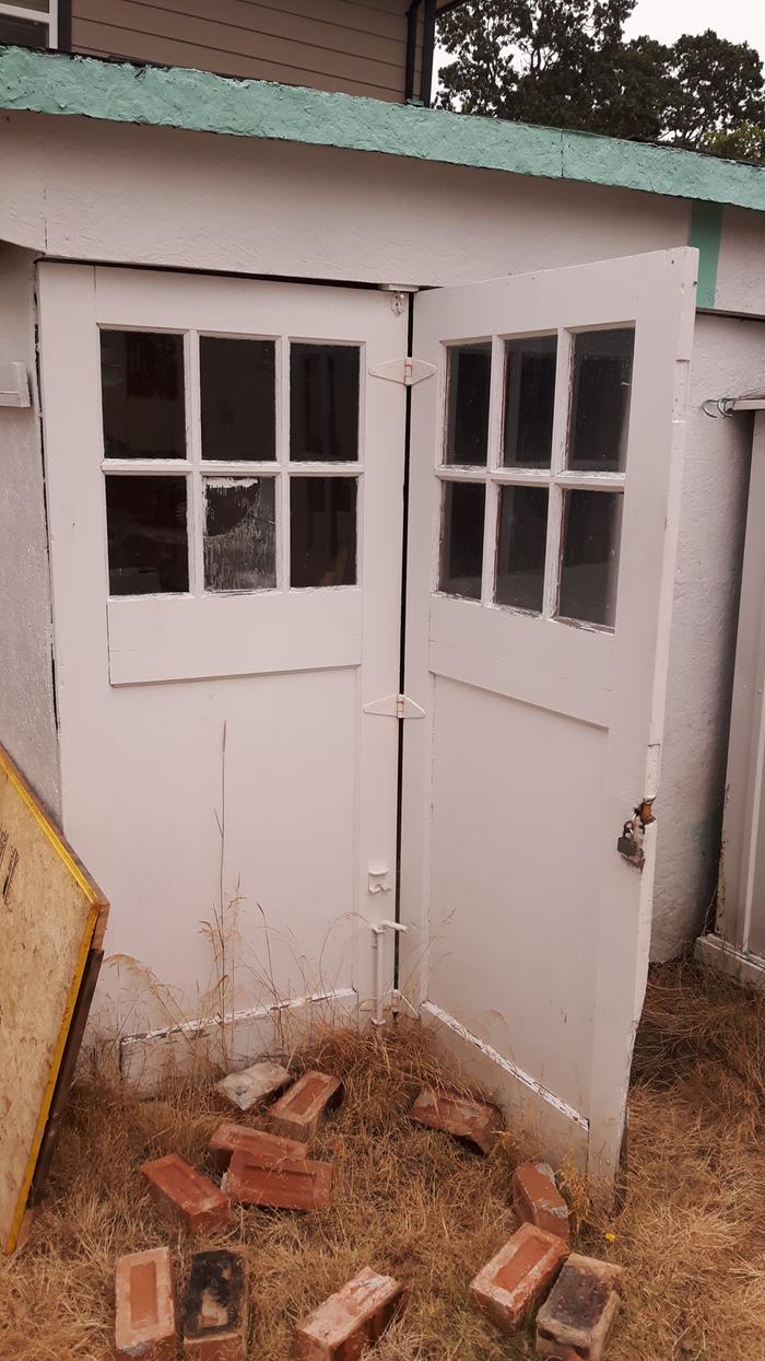 Today's stuff includes a nice shed door, red bricks and some miscellaneous shelving material. There's also a drying rack with pulleys on it.