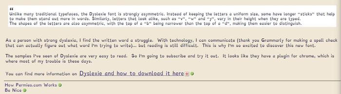 As a person with strong dyslexia, I find the written word a struggle. With technology, I can communicate (thank you Grammarly for making a spell check that can actually figure out what word I'm trying to write)... but reading is still difficult. This is why I'm so excited to discover this new font.
