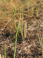Background info: In 2002 I planted 25 crowns of asparagus--I think they were Jersey Knight, but in the confusion of our first year on the land I mislaid the records--in a 50-foot-long trench in the middle of my garden. (The native soil here is basically sand and stone; we've been pouring