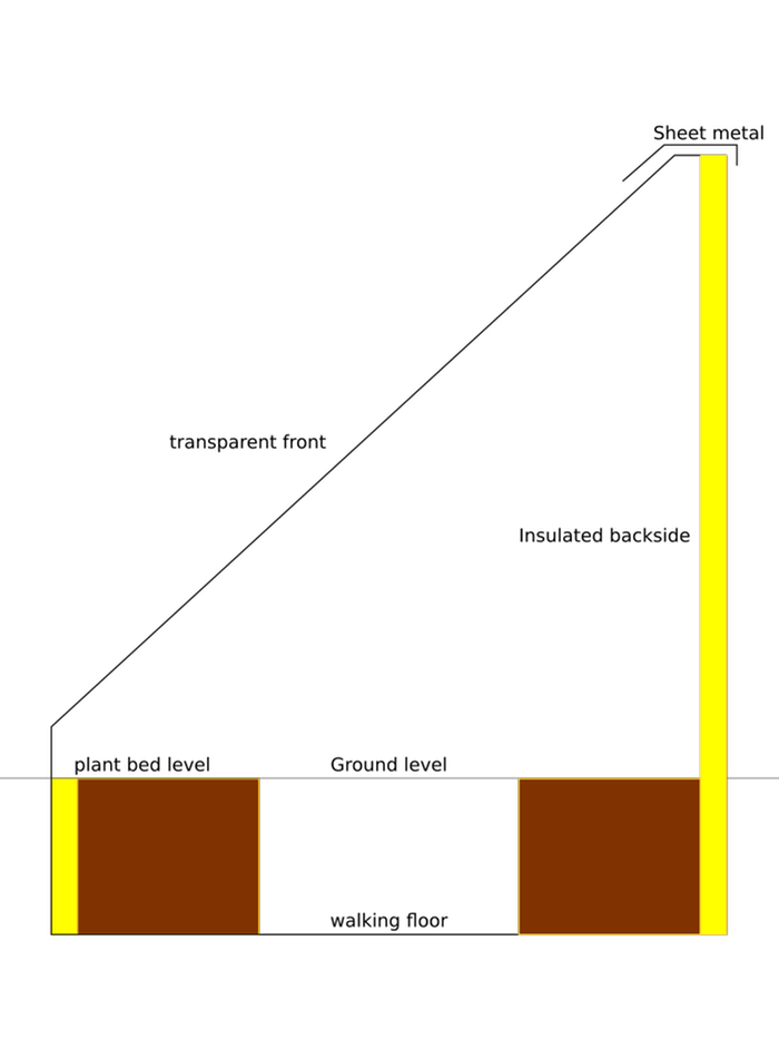 I put in concrete pillars every 1.5m down the 5m length of the greenhouse up to ground level- this is the 'solid structure'. I don't think I could build brick walls or anything on the 'disturbed' earth- though it has now been sat for 2 years. The undegrround bit is insulated.