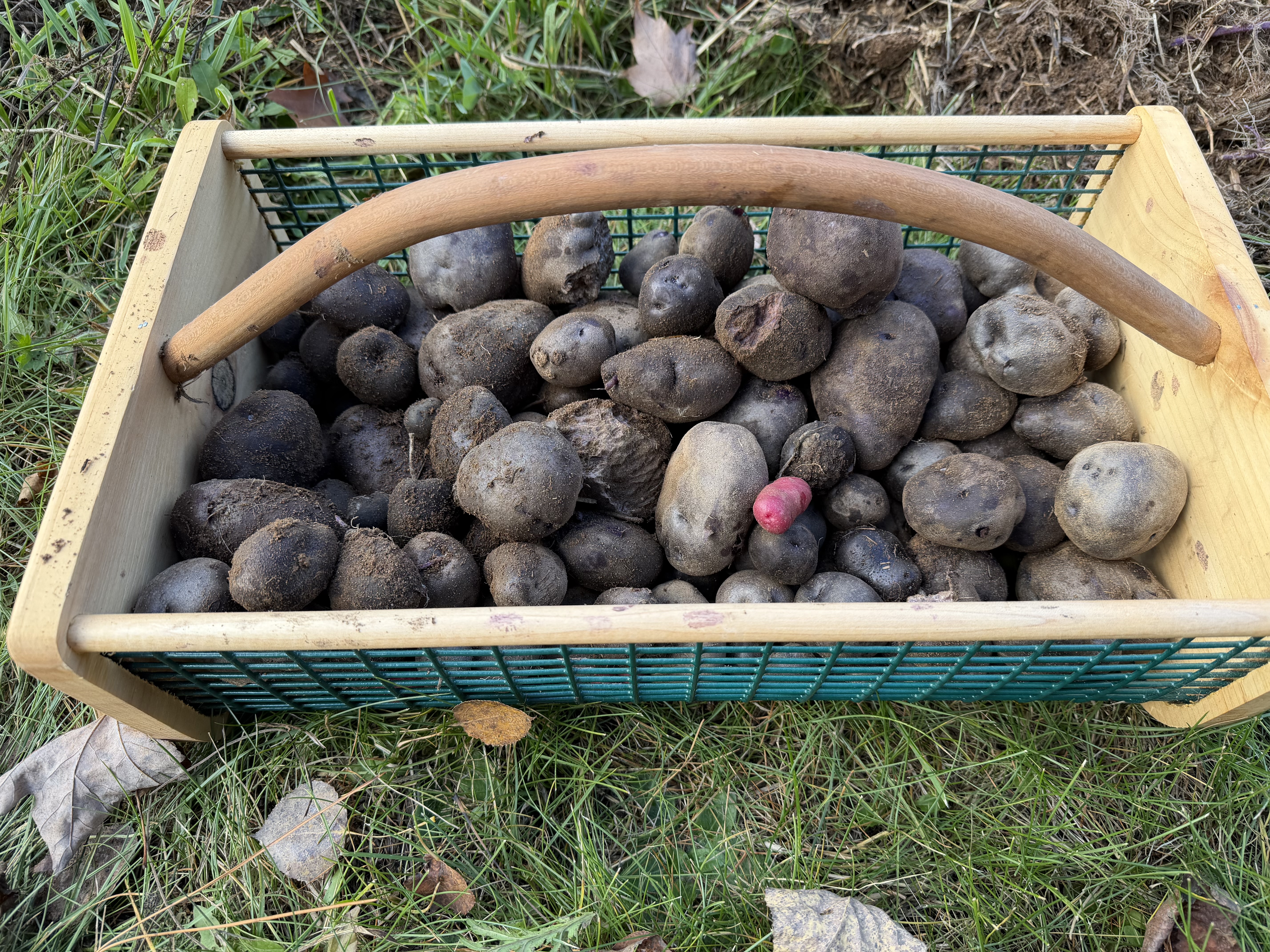 Up above, I posted about late-planting a bunch of very sprouted, wrinkly, rubbery tubers. I dug them today. I got roughly the same volume out that I put in along with a couple bunches of berries. So not An amazing success, but at least they’re edible now!