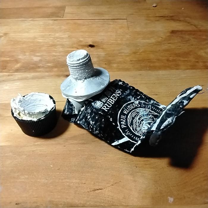 In the end, I got so frustrated with the packaging, i put the remaining paint in some spare tubes (we can buy empty tubes from art suppliers like Kama).  There is probably about 30 to 40ml of paint left.  There is probably another 10ml i couldn't get out of the old tube.  We load the new tubes from the back of the tube, keep tapping the air out, then crimp and turn the open end to seal it.  The same repair that didn't work on the paul rubens tube.