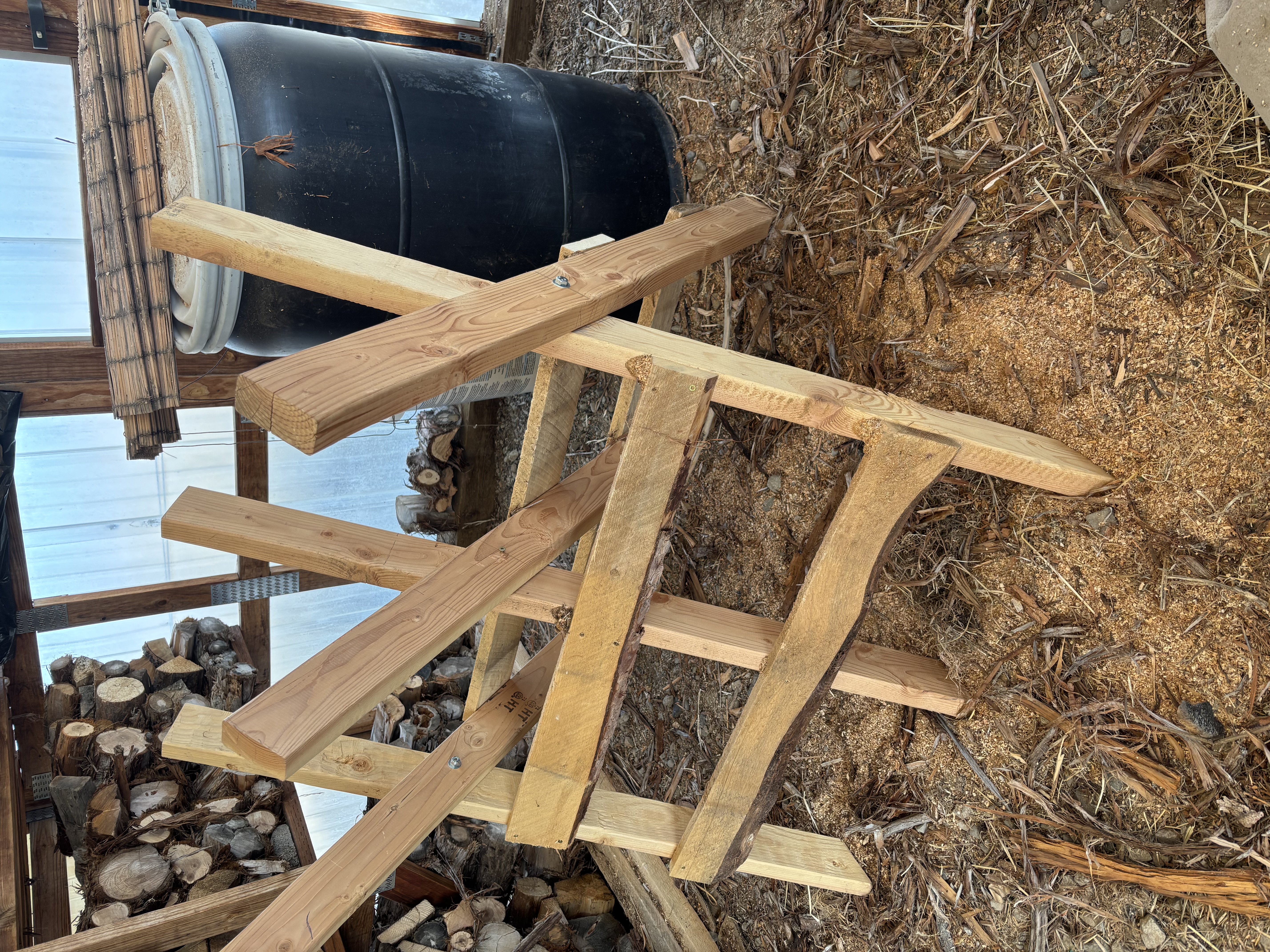As soon as I can pick one end of the log up (helped by an old ice tongs) I place it on a small three leg x brace and can saw standing. In the photo you can see I made this out of dimensional lumber as well because I'm a carpenter and thats what I have lying around. A couple of pieces of metal rafter strapping keep the legs from spreading when a log is dropped in. Once again, the arms of the v the log rests in are too long and will be cut shorter so that I dont have to lift the log as high to place it in the cradle.
