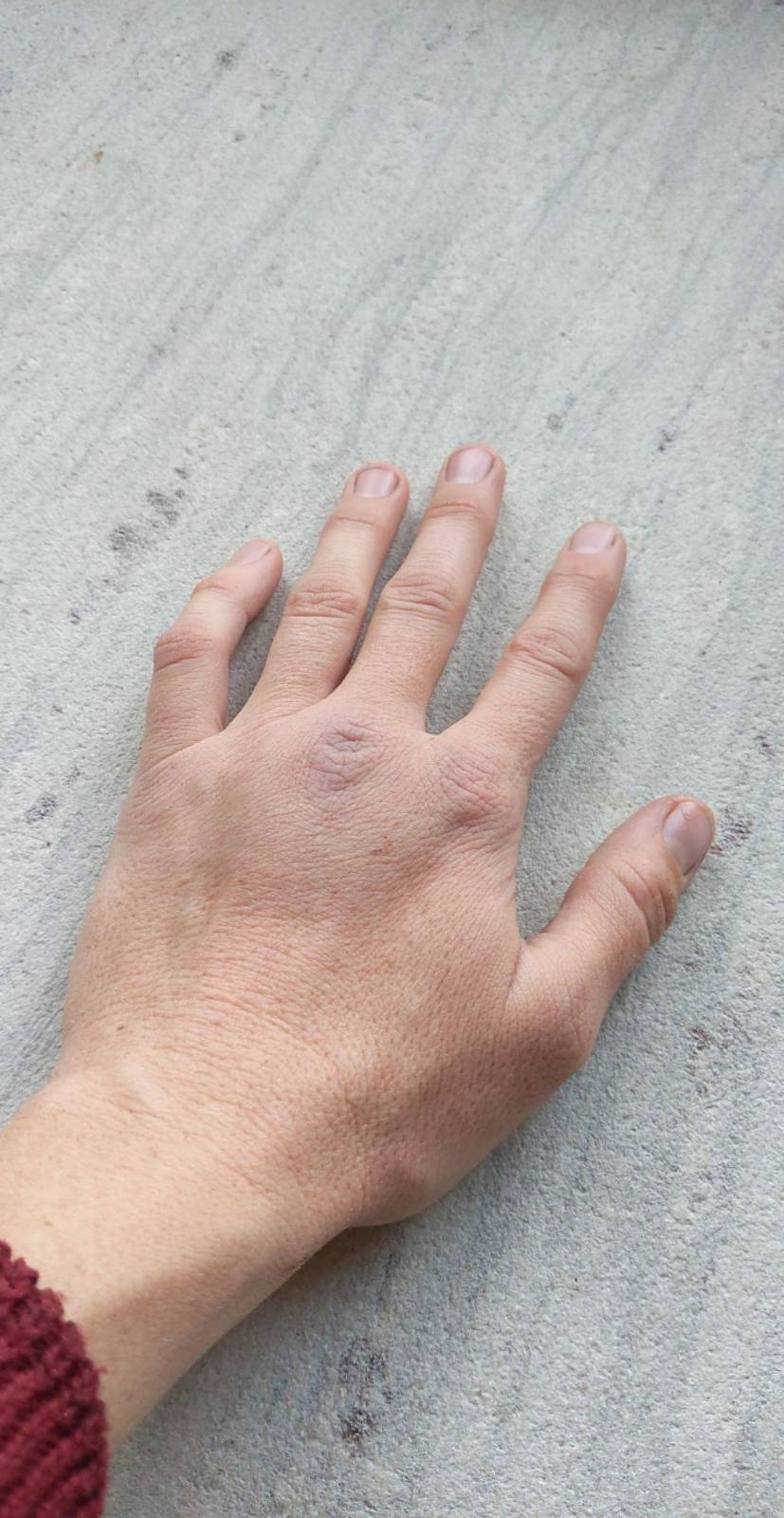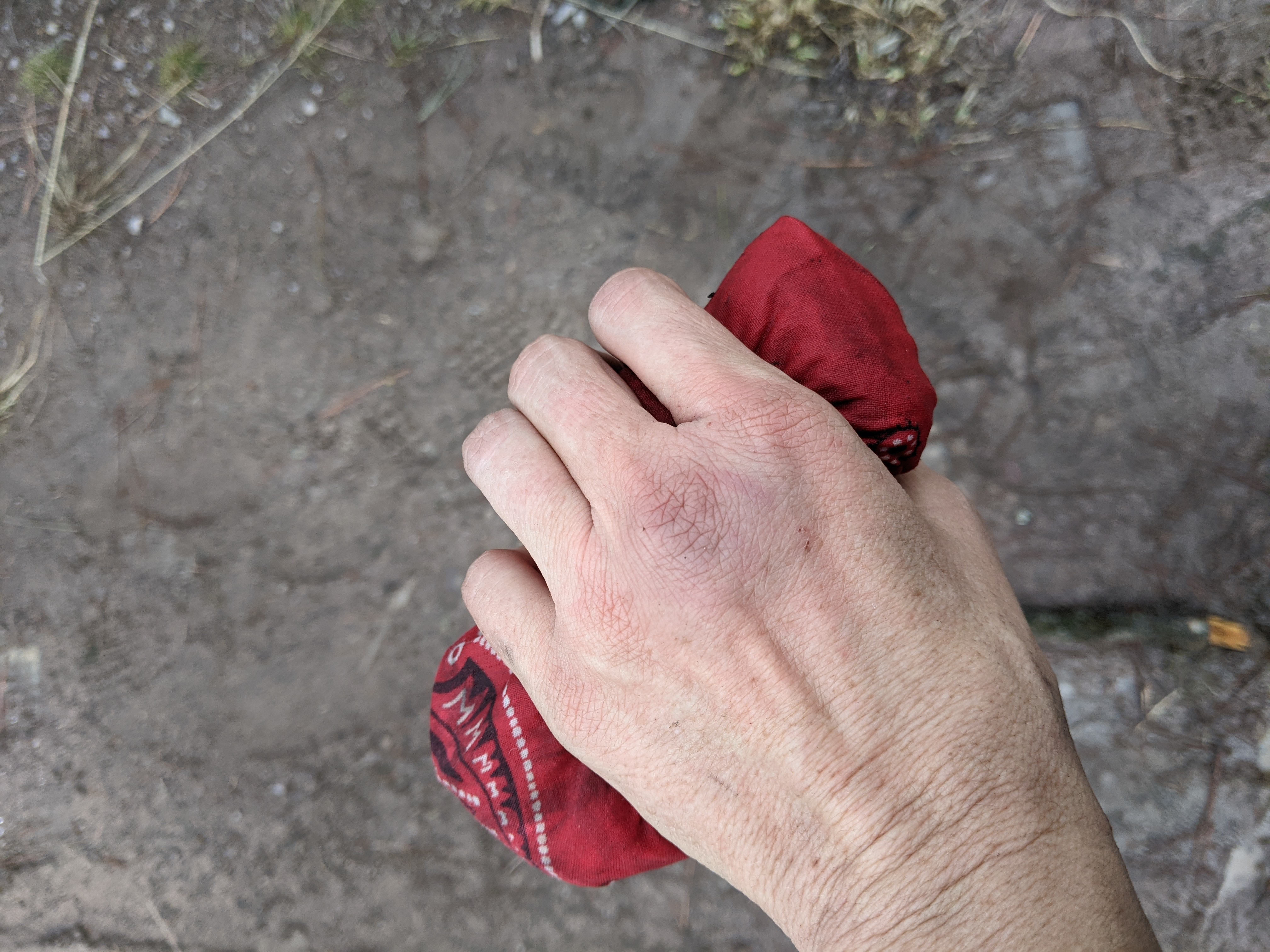 Goose egg on a shin, scratches on the back of the other leg, and a racketball-sized bruise growing steadily outward from my middle knuckle on few back of my hand. Quite a doozy. Other hand had a couple splinters Daniel helped me get out tonight. Nothing broken, so I'm probably fine. 😅