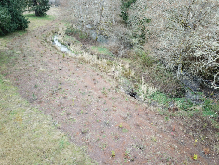 One of the larger side channels with a large riparian planting area next to it - this planting area used to be a road with a golf cart storage building.