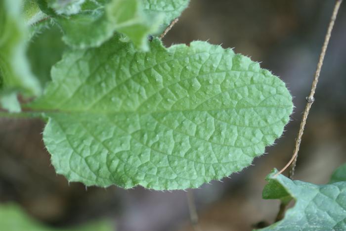 The second photo borage's rather bumpy looking leaf with deeper veins, more bristles, a more irregular margin, and a more rounded tip.
