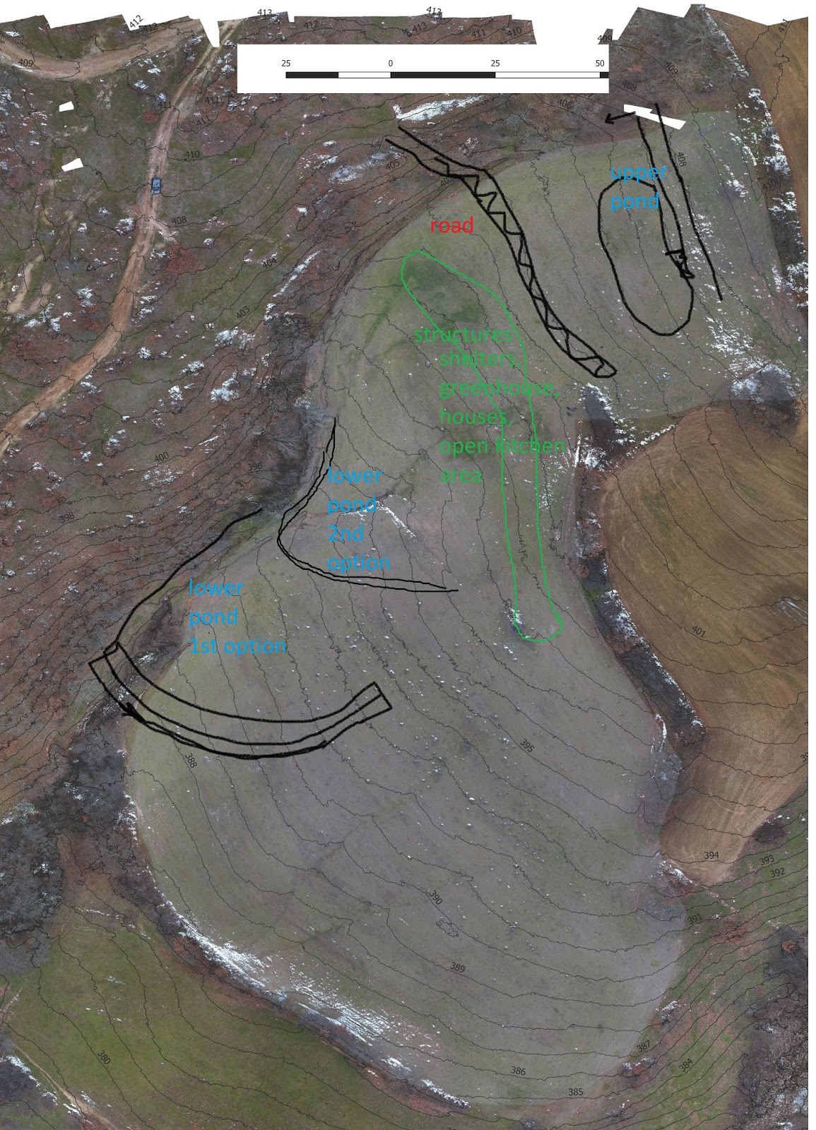 To the west there is are gullies and a small winter creek (more like a ditch size). I rely on the winter ditches because it has streaming water in the winter. And they bring water from upper parts of the terrain, forest areas. I am at stage of beginning the waterworks, ponds and swales. I plan to locate a pond as high as possible with regards to winter runoffs and ditches. The ponds will be about 4-5 meters deep because there are 3-4 months without rain.