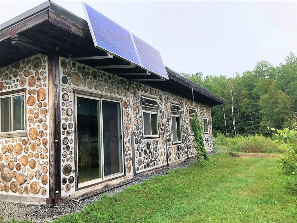 Off-grid, timber-framed 900sf cordwood house with 18"-thick walls surrounded by turnkey farmstead for sustainable living.