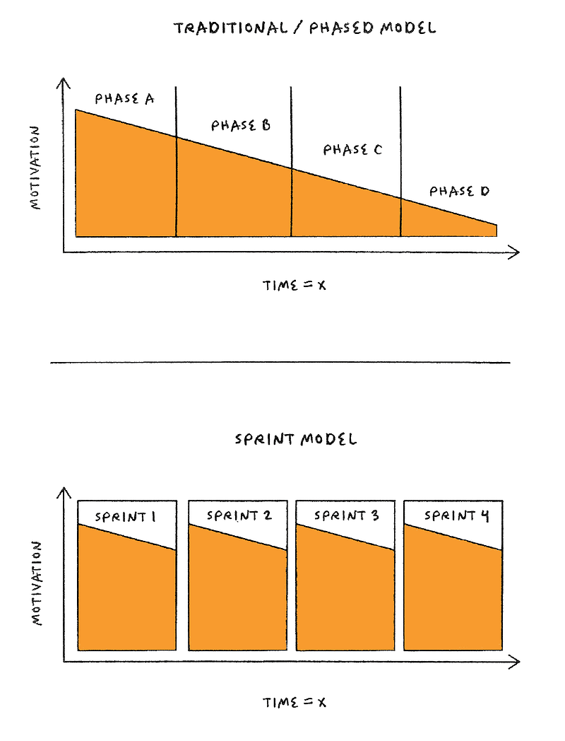 How are Sprints different from just dividing a goal into phases? Unlike phases, which are not ends in themselves, Sprints are independent, self-contained projects—thus the outcome is, let’s hope, a source of satisfaction, information, and motivation to keep going