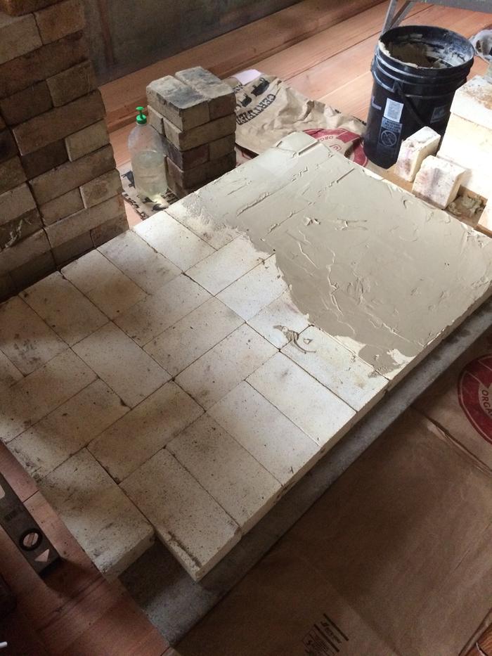 As far as putting the full sized fire bricks i found today that not making them wet at all and just using fireclay(clay slip) resulted in the best results.