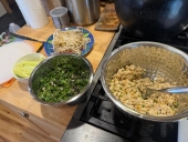 In today's lunch, I prepared four dishes of fillings: 1) crumbled tofu that was bought firm, frozen, thawed, pressed, and marinaded in vegan "fish sauce" mixed with crumbled toasted peanuts and diced jalapeno, 2) chopped cilantro and Thai basil blossoms and rosettes, 3) cucumber matchsticks, 4) mung bean sprouts. That's a pretty typical set of fillings we use, but also whatever we have as leftovers I want to use up is common. The dipping sauce is custom-made each time and today's was from peanut butter, minced Fresno chiles, a ton of minced garlic, simple syrup, shoyu, mirin, rice wine vinegar (and it came out too thick).