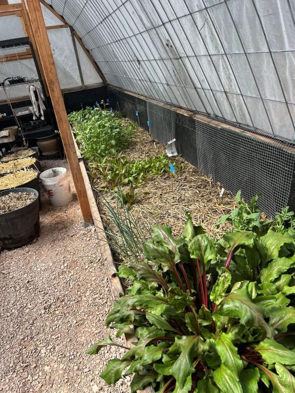 I planted more radishes and carrots and a bunch of leafy greens and have been enjoying fresh salad fixings for the last 6 weeks.  One of the beets is the size of a softball. We eat the greens in salads, so I've been letting them grow. We ate a few of them and they were delicious. Oh yeah, I left one broccoli plant. It's just starting to bolt It's the tall one in the back on the left side. I've planted some peas, broccoli, more greens