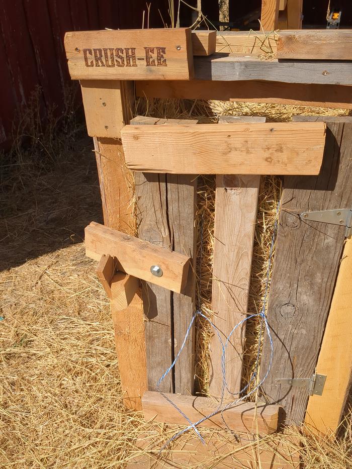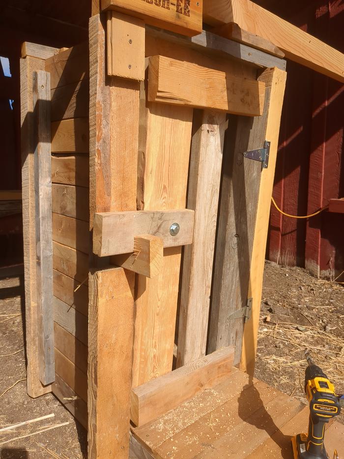 I got a 5/8" dowel and cut it into a bunch of 5 inch pegs. I later realized that I didn't have a big enough drill bit to make holes that these would fit through so I had to whittle them a bit and hammer them in (which also meant no glue but at the same time the holes weren't super straight so it's a little cattywompus (is that a word?)). I sanded these by hand.