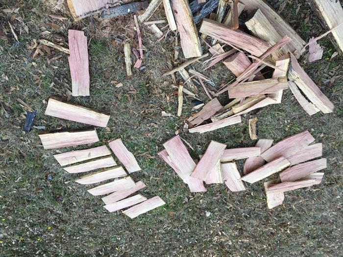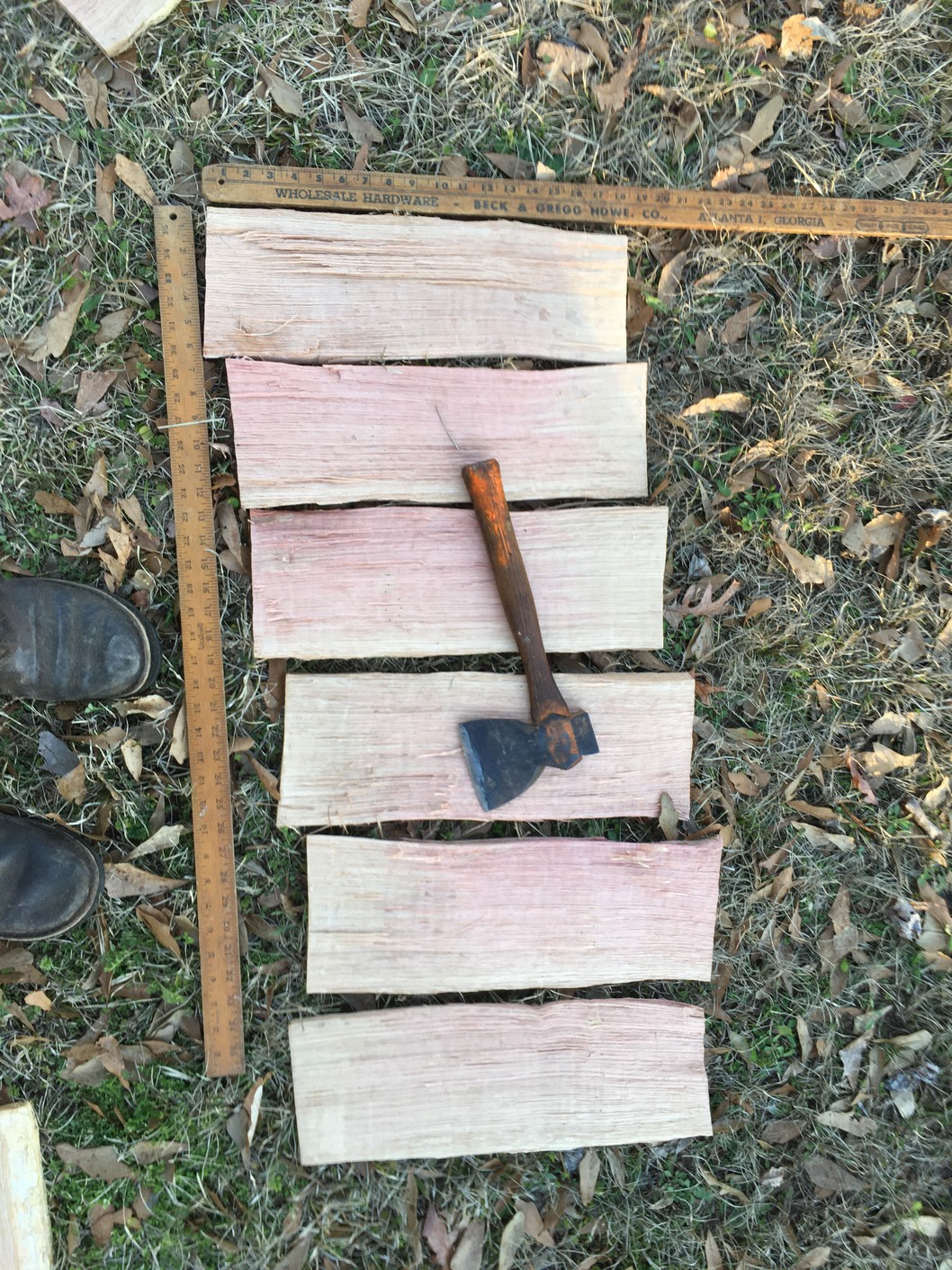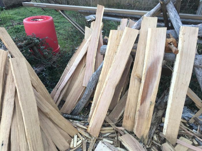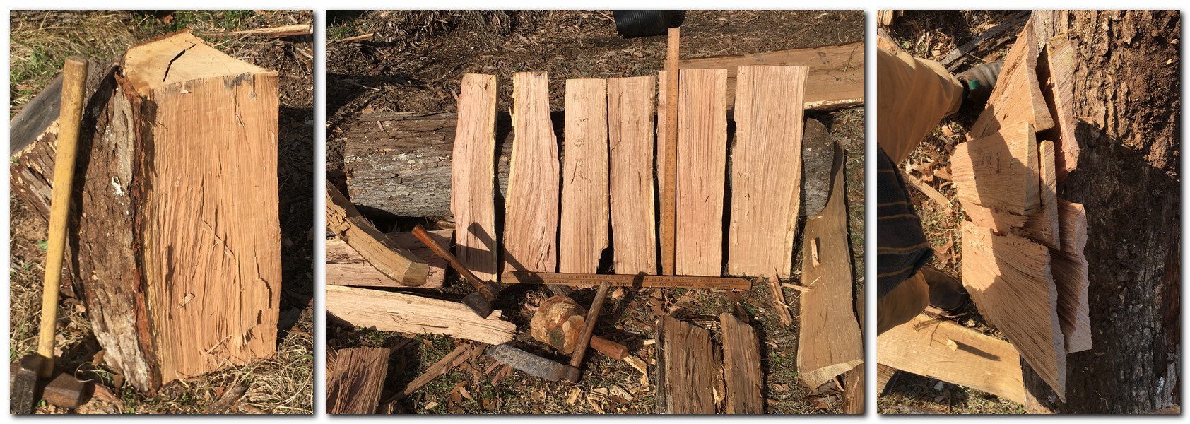 The next day I managed to knock off some wedges from the side of the same log without the branch interfering too much. So after all that here's 6 rough white oak shakes longer than 20" and at least 6" for that amount of length. Two are quite wide.