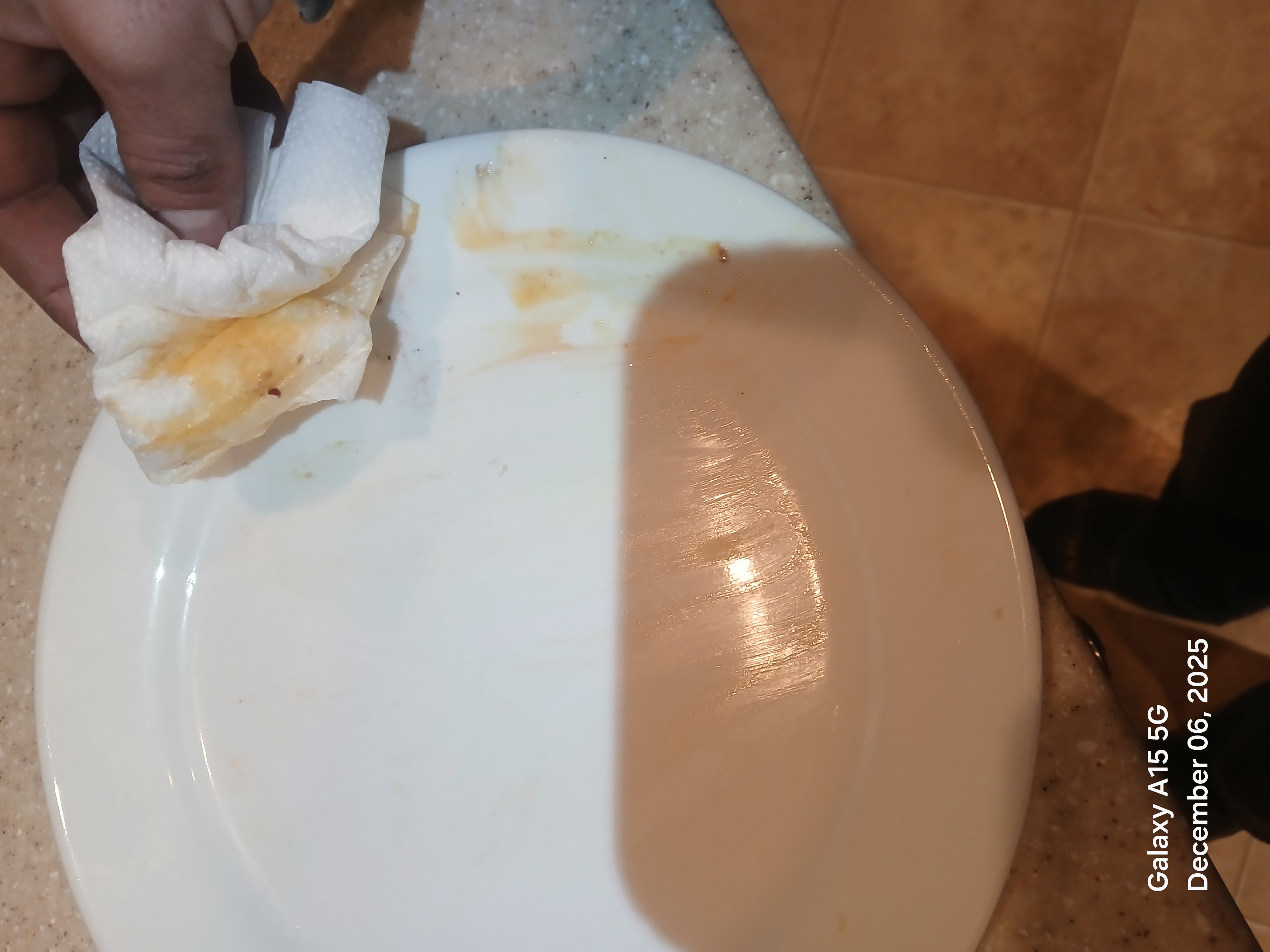 - clean an oily dish (plate or bowl--not a skillet/pan/pot/etc) without soap