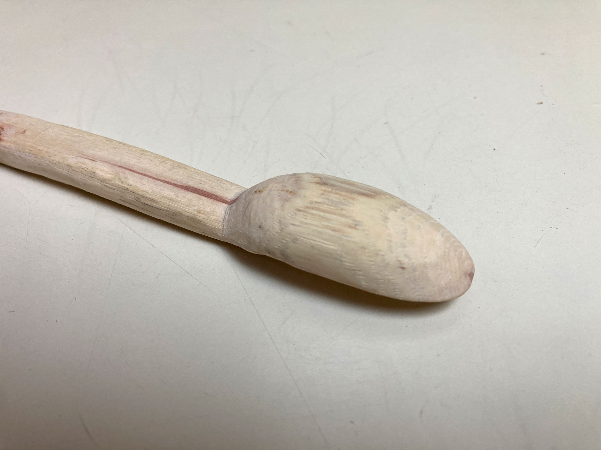 This is a redo of my wooden spoon submission. Yes, there were some fine wooden strands still on it. I went back and used a rock as well as actual sandpaper to get a better finish. It now feels completely smooth. There are some rounded ridges on the concave part of it, but nothing that comes free or that you can feel as rough or loose. I would give this to my 90 year old mom to use.