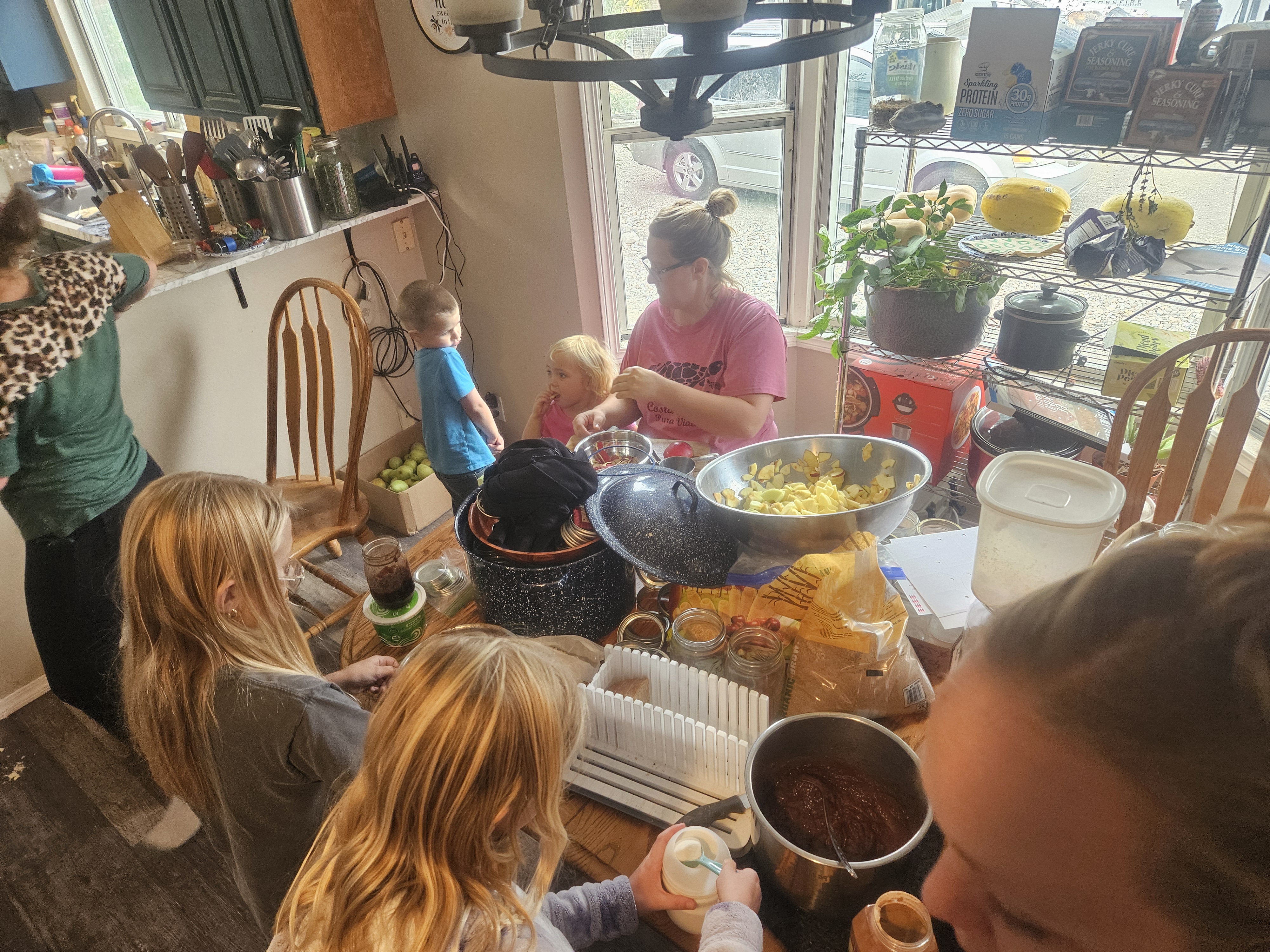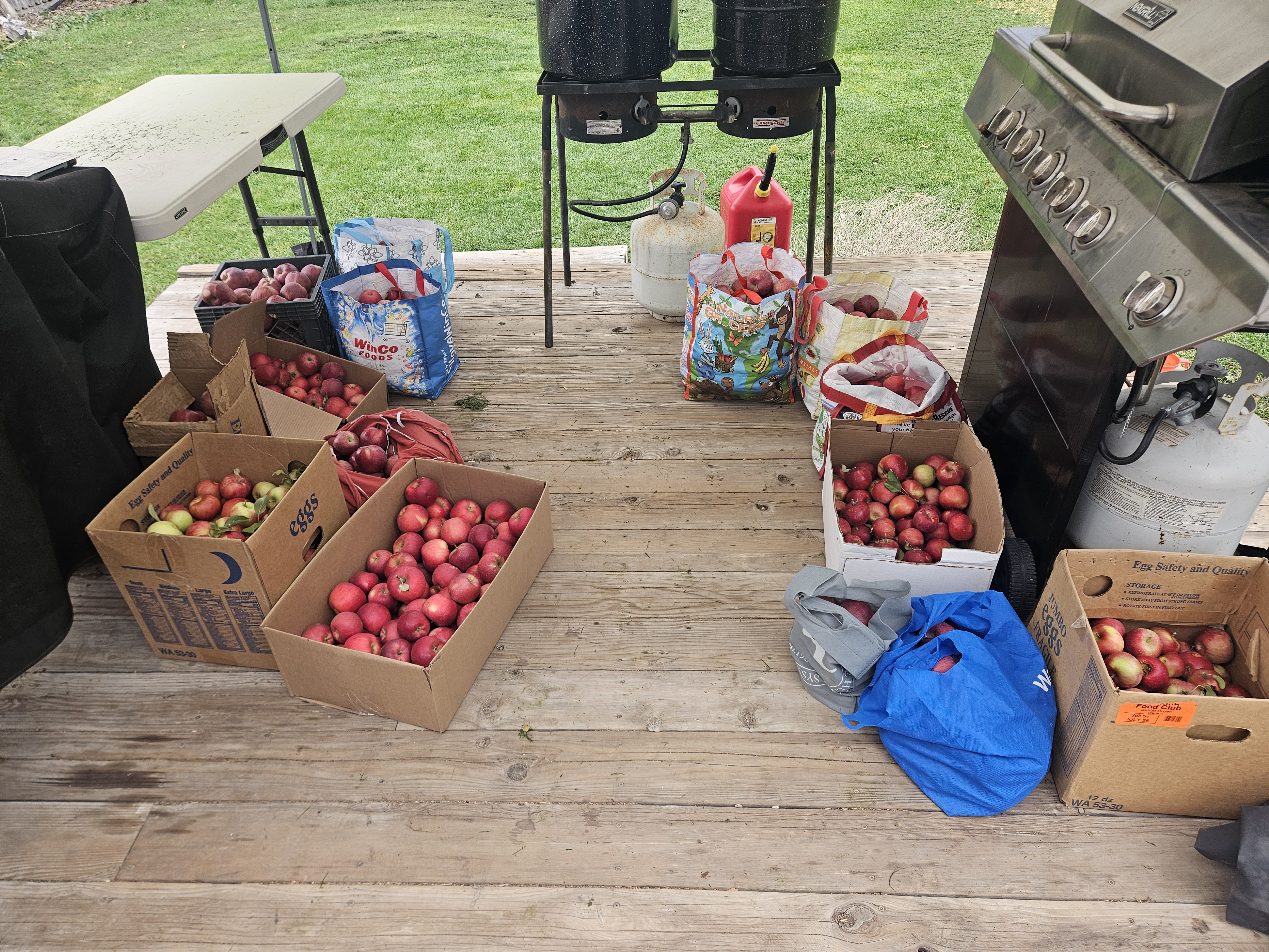 The bottleneck in productivity was spaces on a cooktop. We used campsites outside, which took forever in the cold, used a lot of propane, and burnt sometimes. In hindsight, we decided that using instant pots would give us unlimited "cooktops", would be less likely to burn apples, and may even be faster.