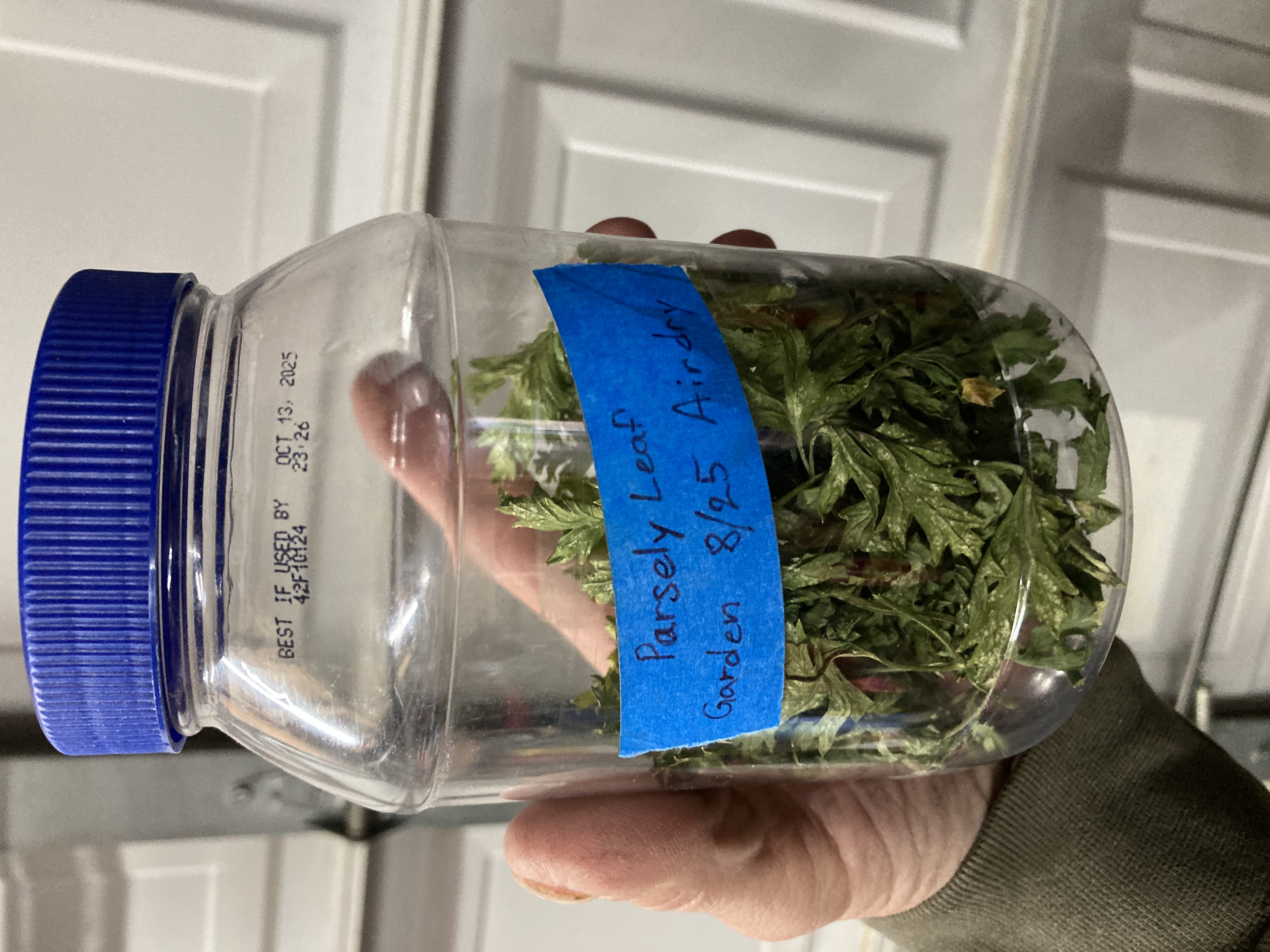 - a picture of your herbs in a sealed and labelled container, with the label indicating where the herbs came from, the method of drying, and the date