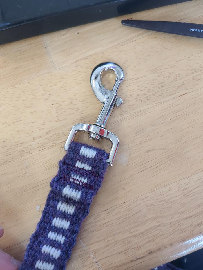 - the finished leash - showing handle, attached hardware, and possibly a ruler or tape measure
