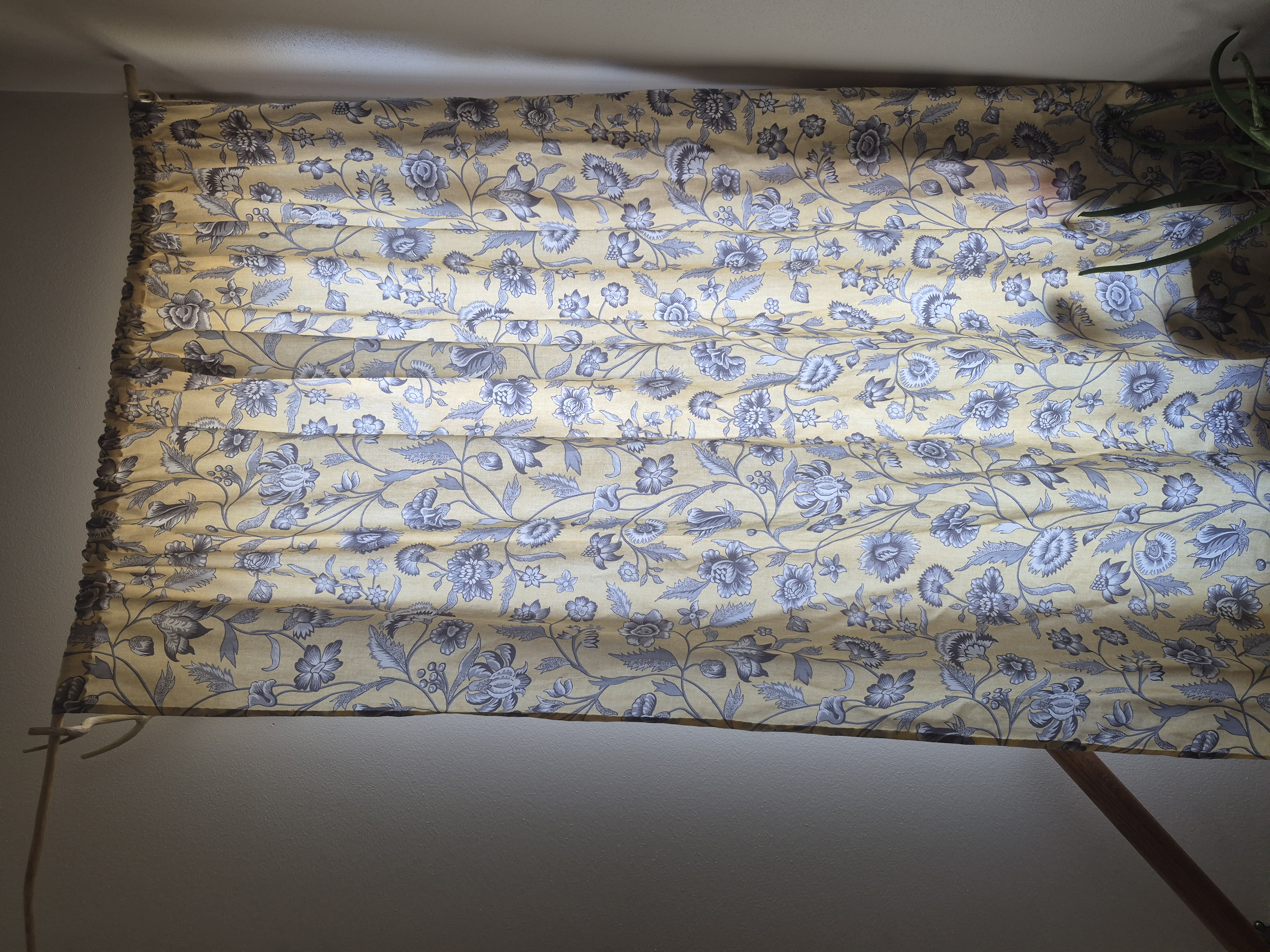 Curtain is made from 100% cotton twill remnant I found. I hemmed the edges, top and bottom by hand with mercerized cotton thread for a polished invisible look.