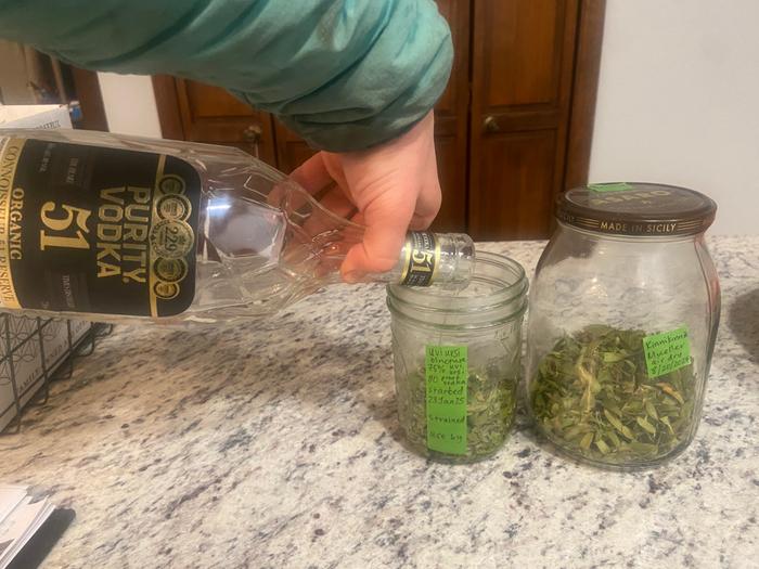 I harvested and dried the kinnikinnick from the wild over the summer. I then filled 80 proof organic vodka to cover the herbs. I shook the jar and stored it in a dark cabinet. Then strained it.