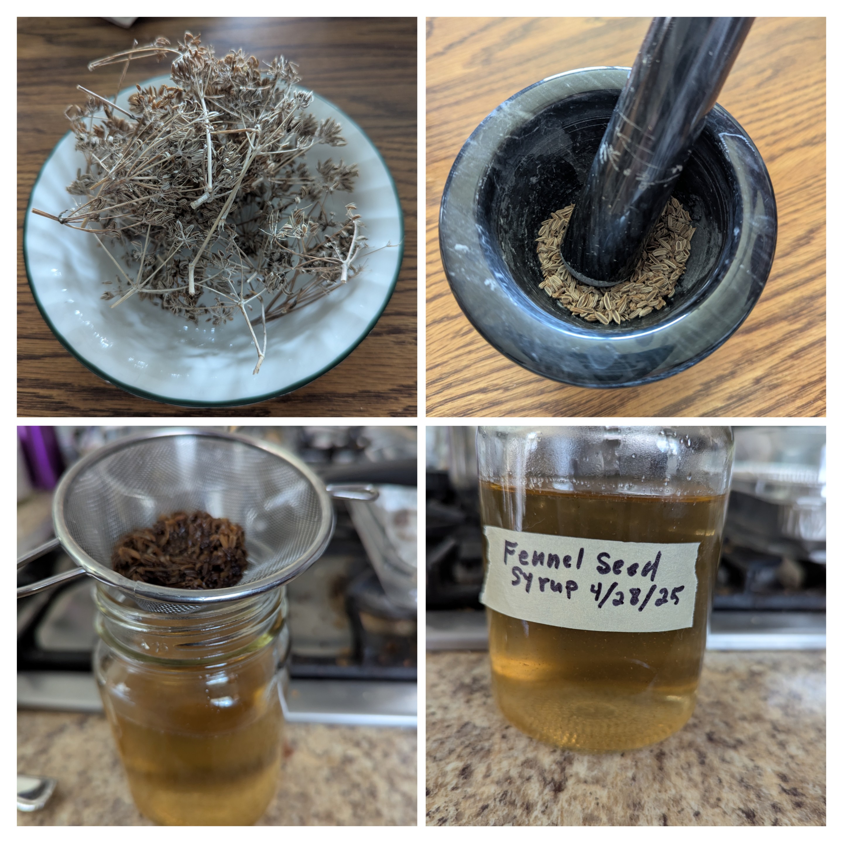 I used about a tablespoon of seeds and ground them up a bit in a mortar and pestle. Then I put a cup of water and almost a cup of sugar in a pot with the seeds. I brought it to a gentle boil and stirred it well to dissolve the sugar. I turned off the burner and let it steep for 20 mins. Finally I strained it into a jar.