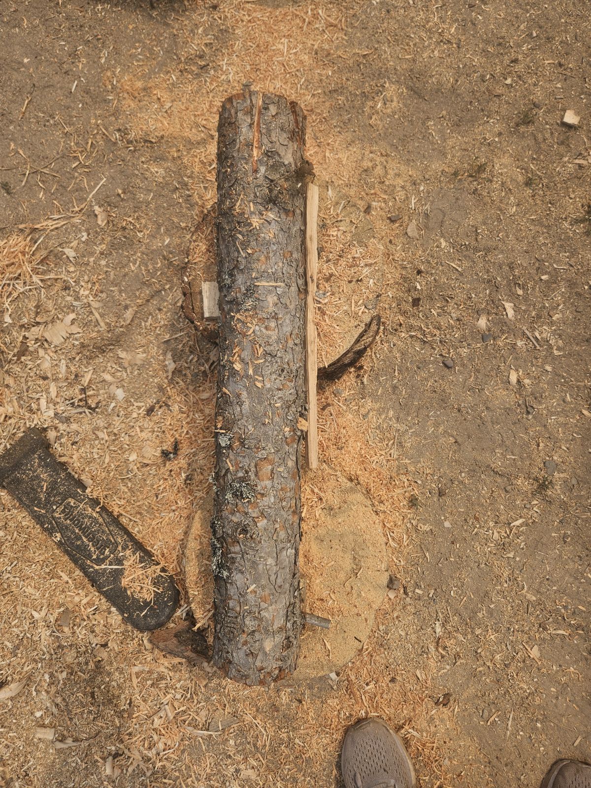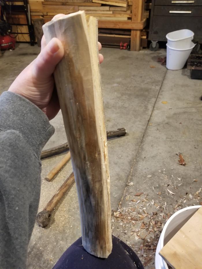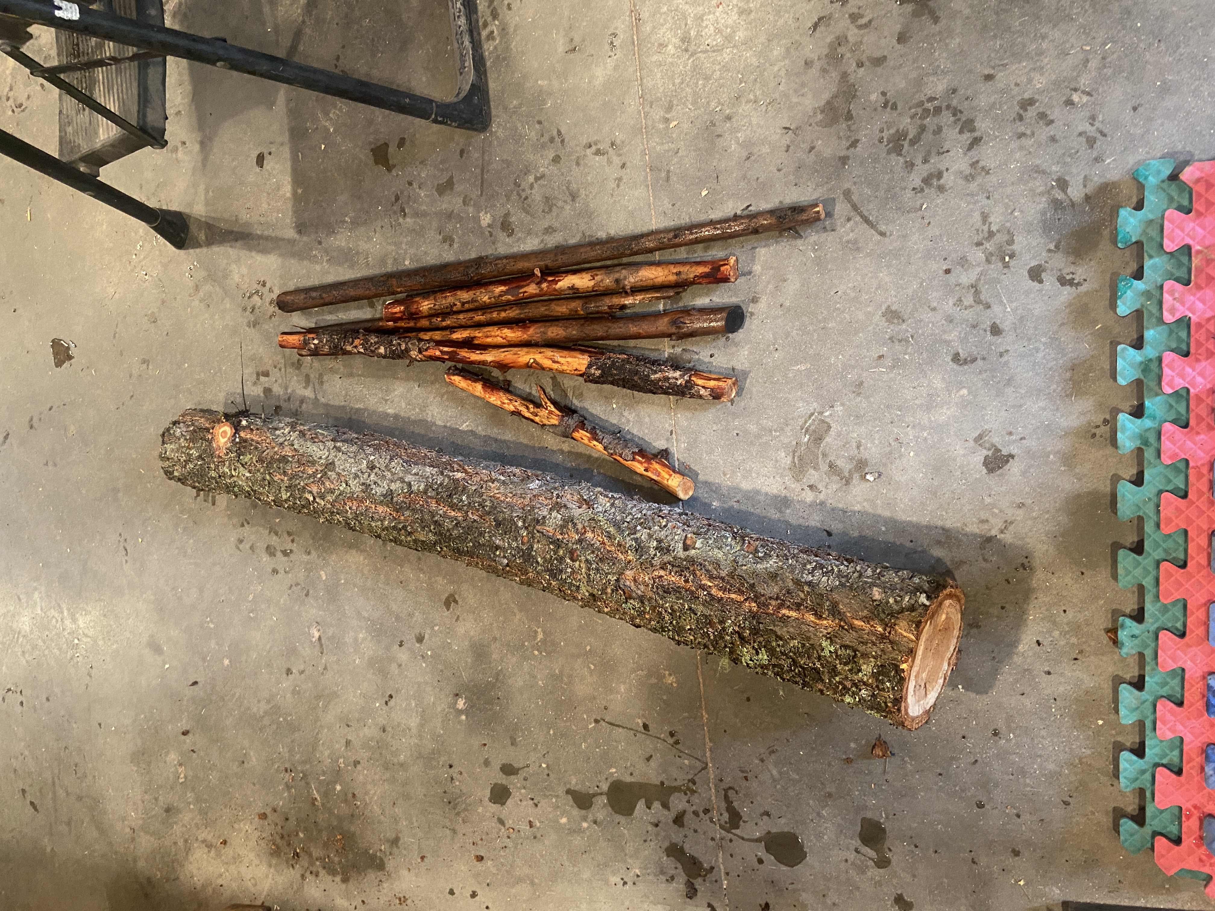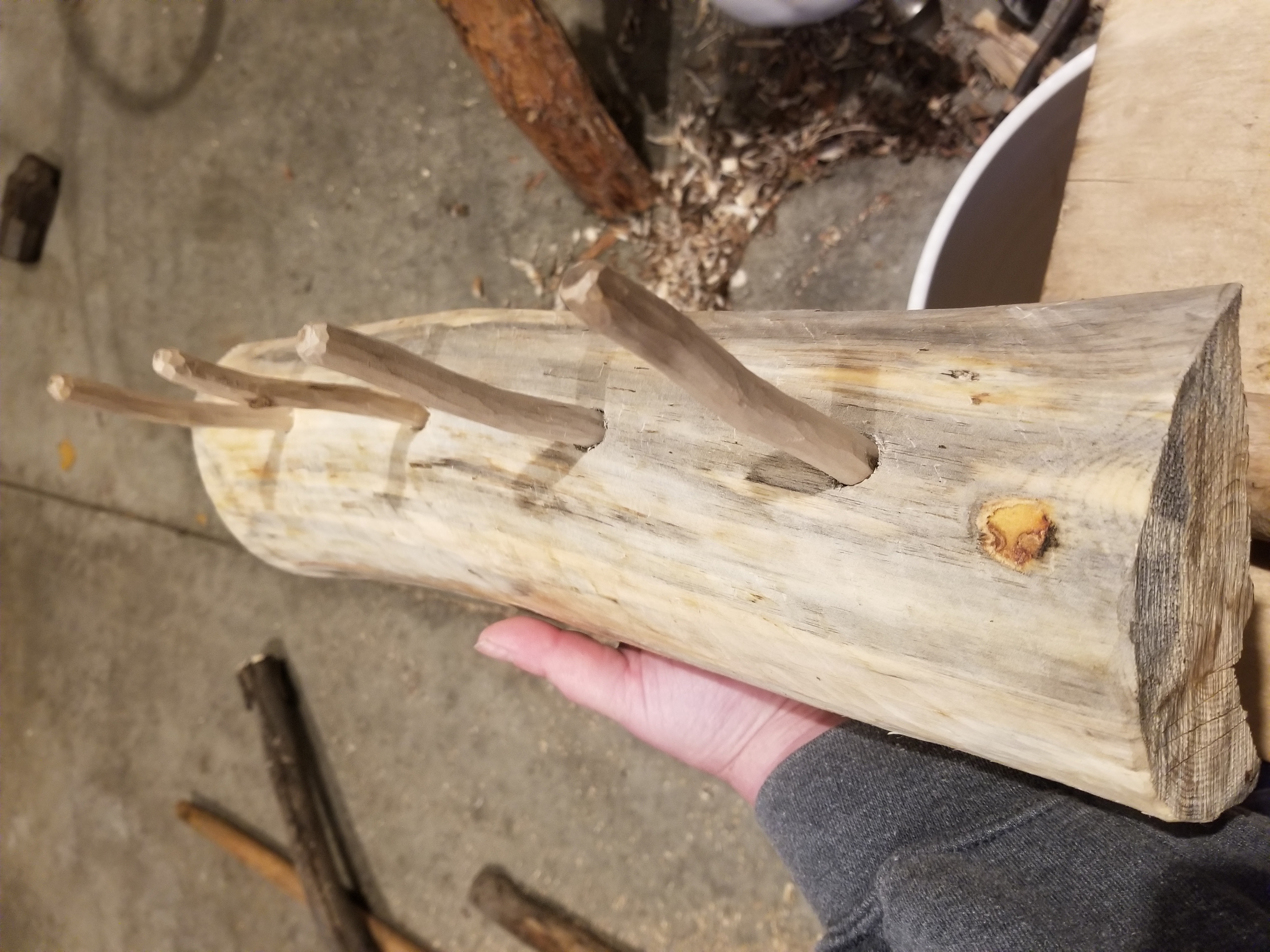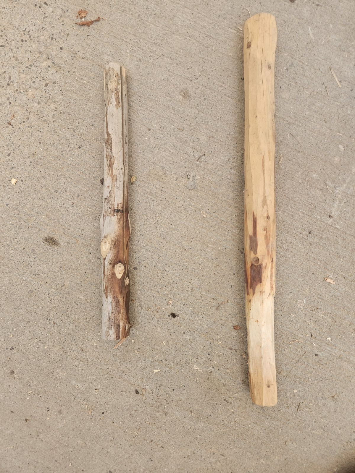 This was a multi-day project. Since I wasn't able to complete it in one day, I had to cut a new piece of of wood. That's why there are two photos for "starting chunks". The second chunk was shorter and skinnier and peeled way easier than the first chunk.