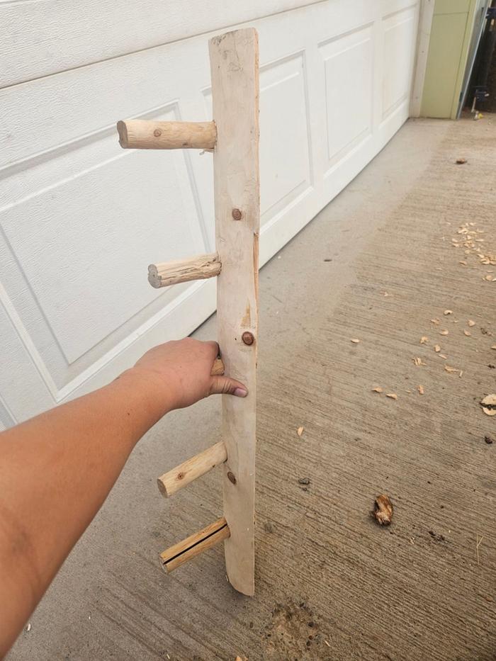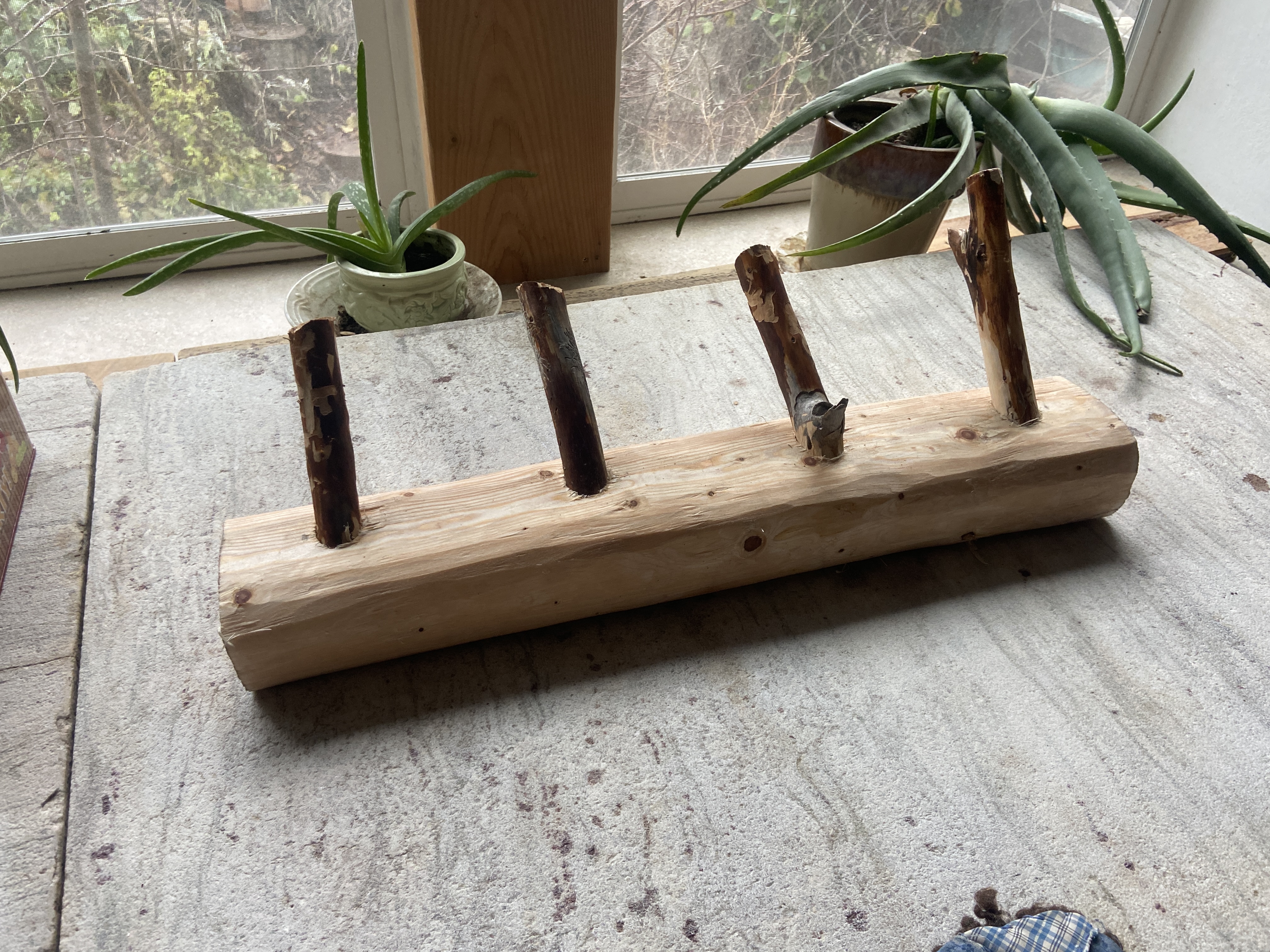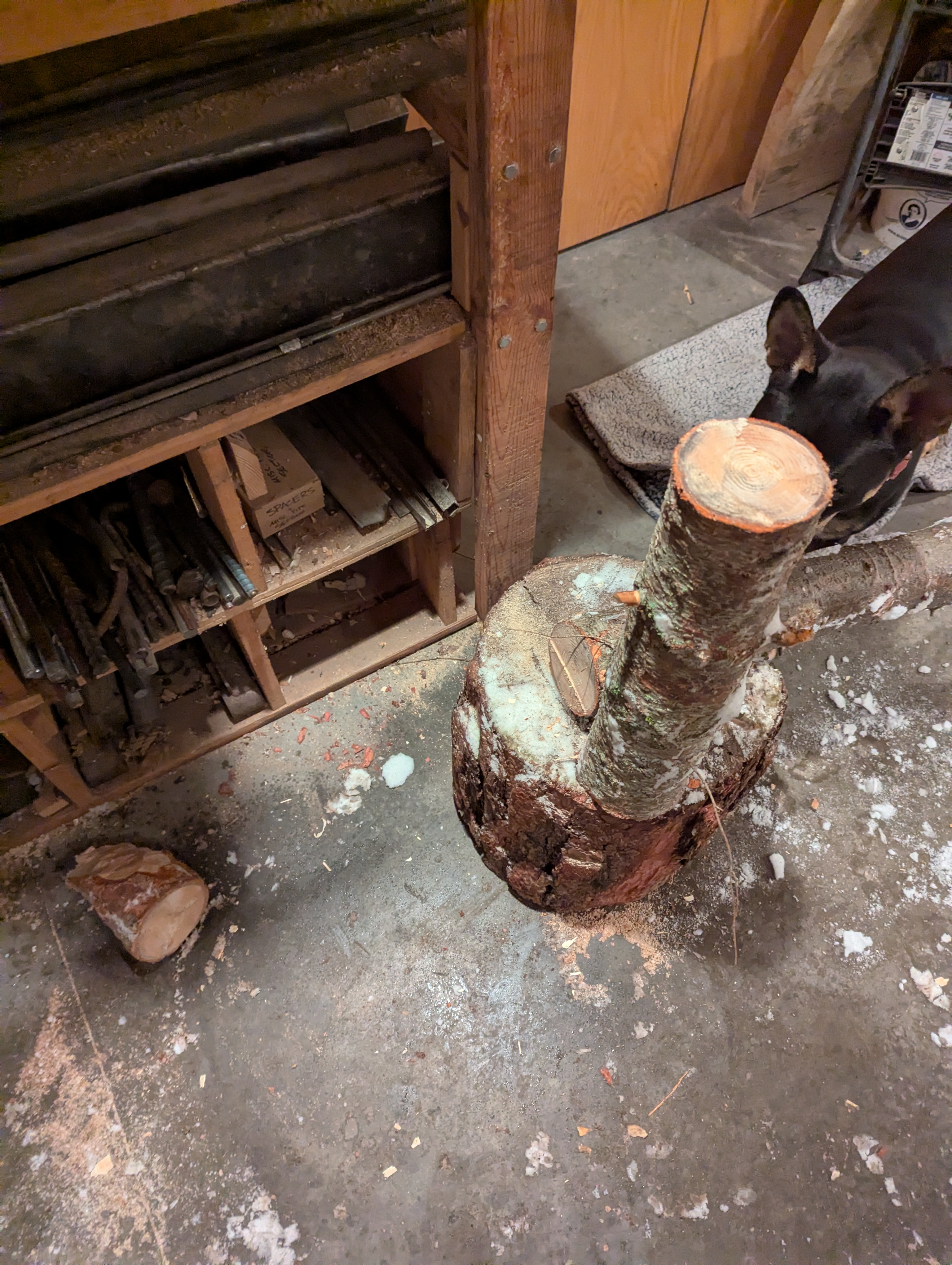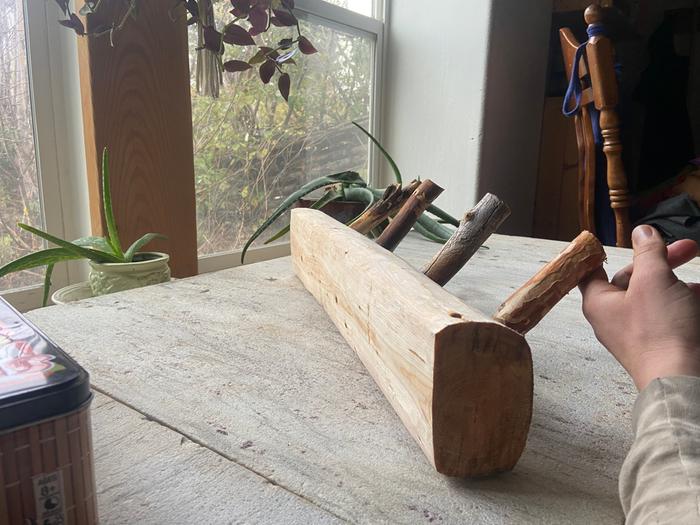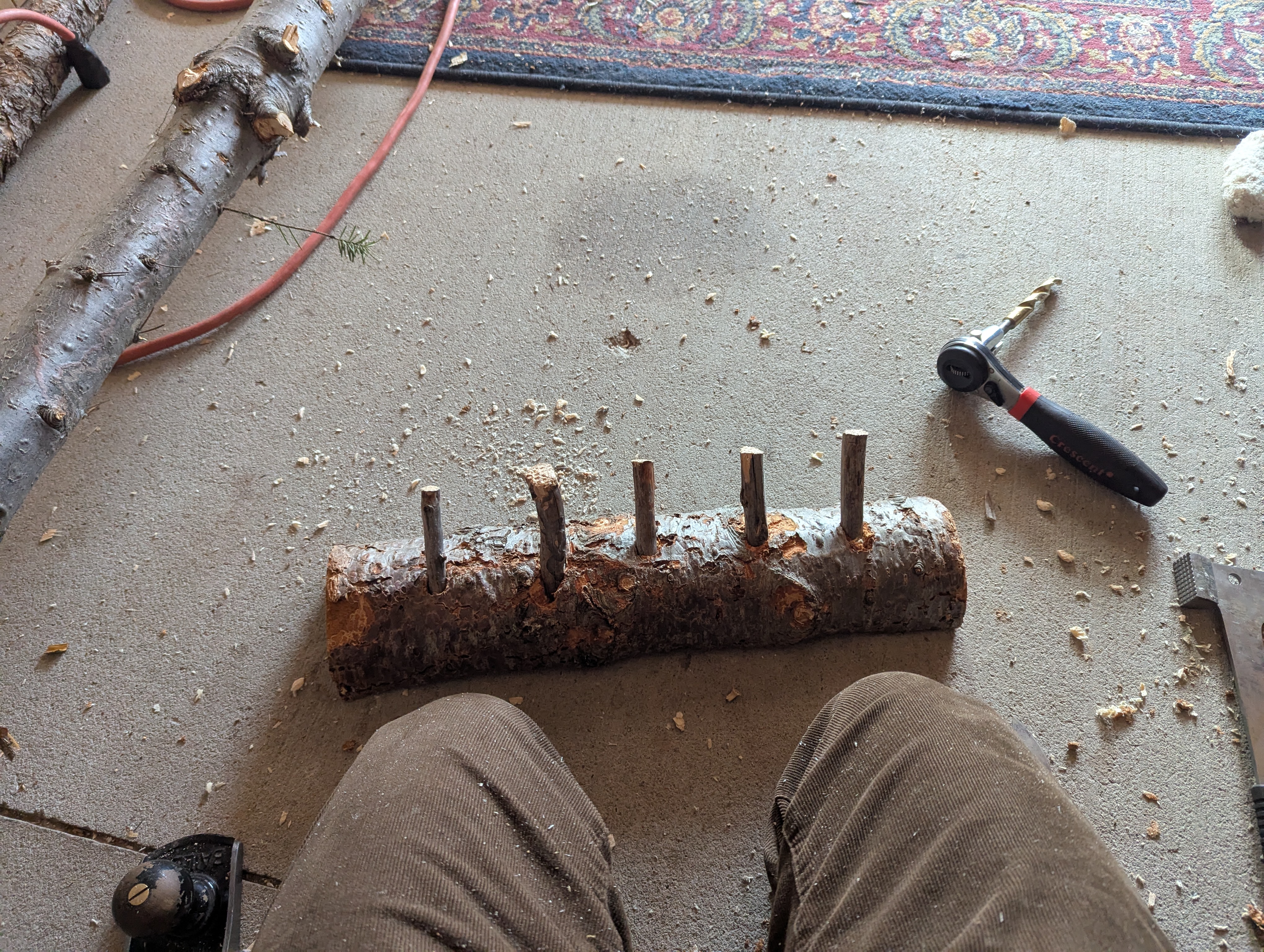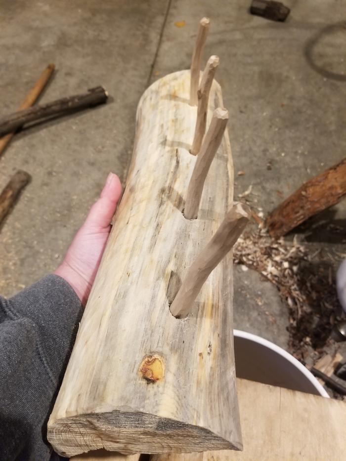 This was a multi-day project. Since I wasn't able to complete it in one day, I had to cut a new piece of of wood. That's why there are two photos for "starting chunks". The second chunk was shorter and skinnier and peeled way easier than the first chunk.