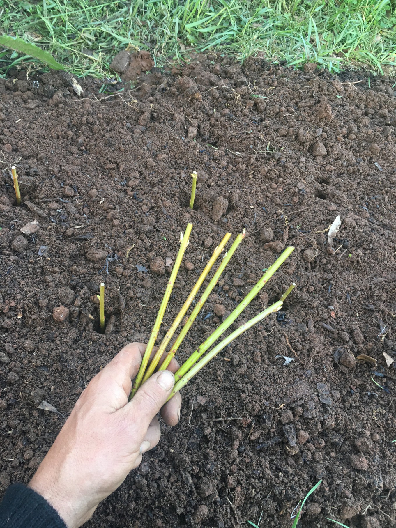 18 willow cuttings planted, larger ones cut off to an appropriate height
