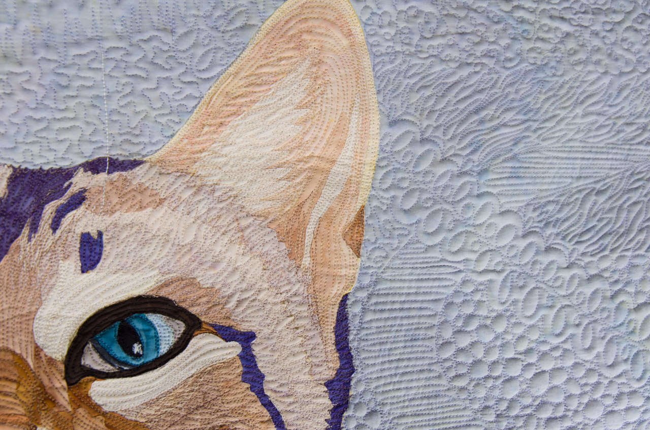 M Rives wrote:My wife quilts. Over the years, she has become quite good, I think... She created an applique design for the cat from a photo then put it all together and quilted it. The horse started as a blank white piece of fabric which she painted and then did more thread painting on top. The larger quilt includes some intersting over/under 3D imagery with the 'ribbons' of thread. She rotates through hanging these and many others on our walls.