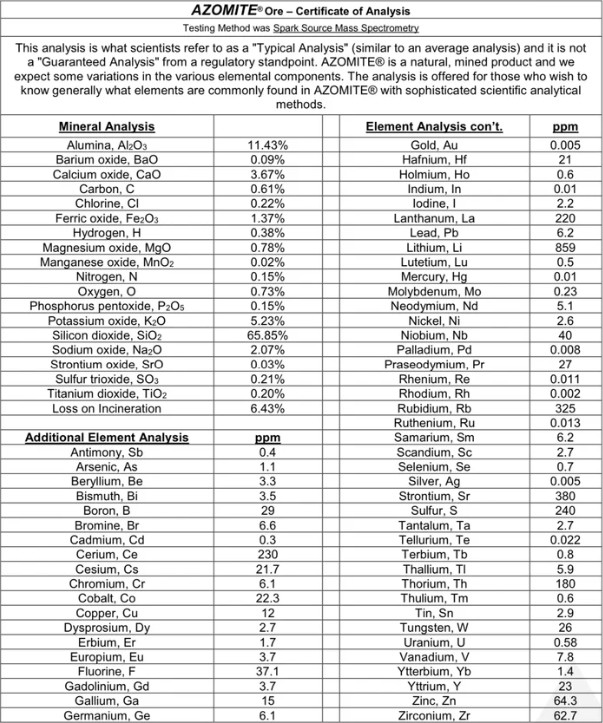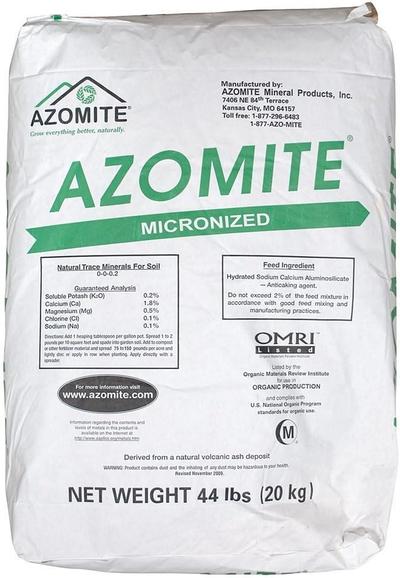 Azomite is a blend of minerals (complex silica ore) sourced from a particular volcanic ash deposit in Utah, USA. Advertised as containing over 70 minerals, this product is said to help remineralize soils in growing spaces. Azomite comes in several forms (micronized, granulated, field, ect ect) which effects how quickly it is available for plant uptake.