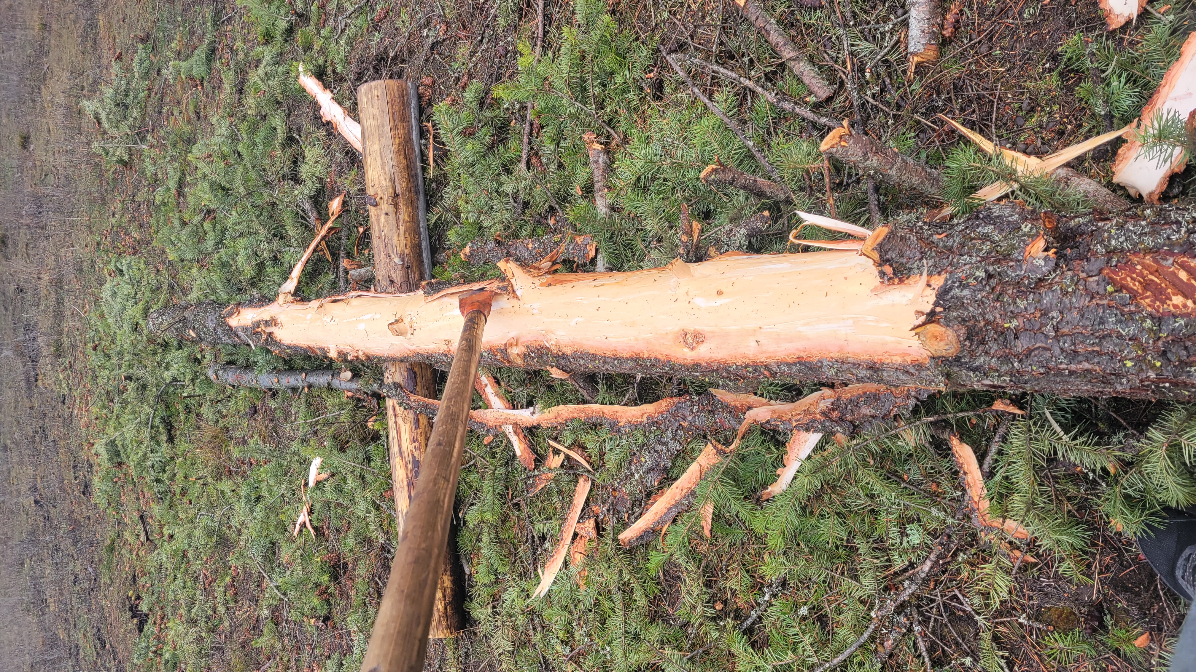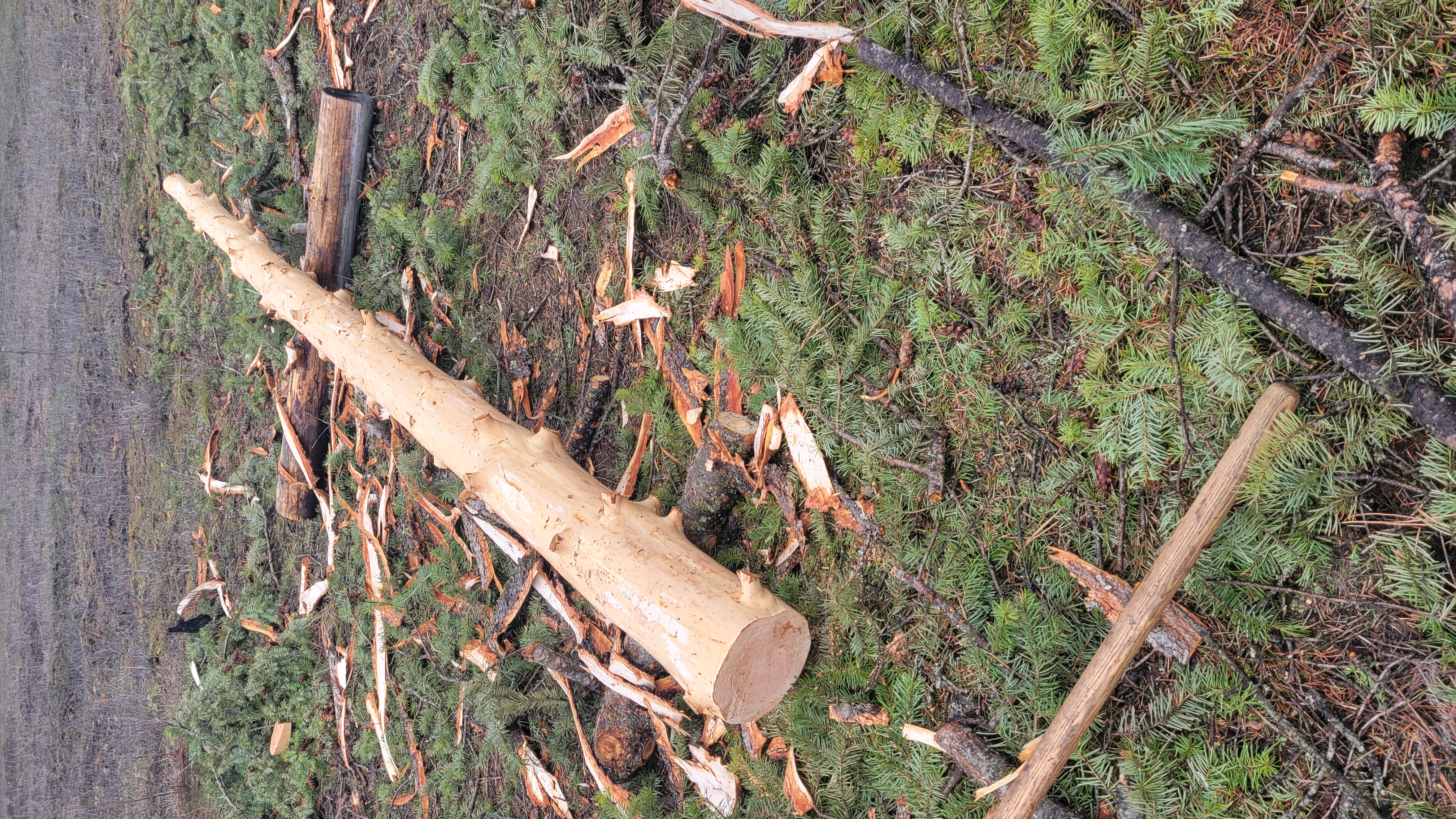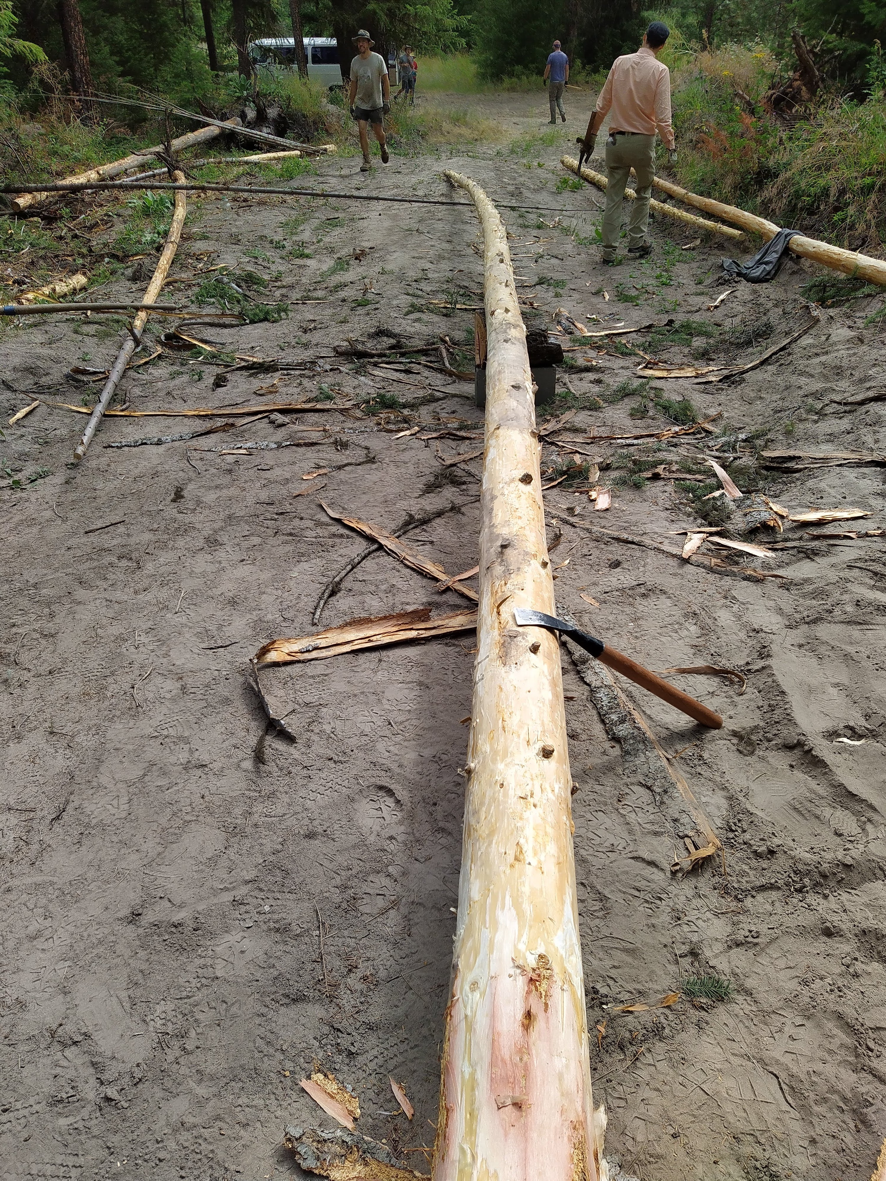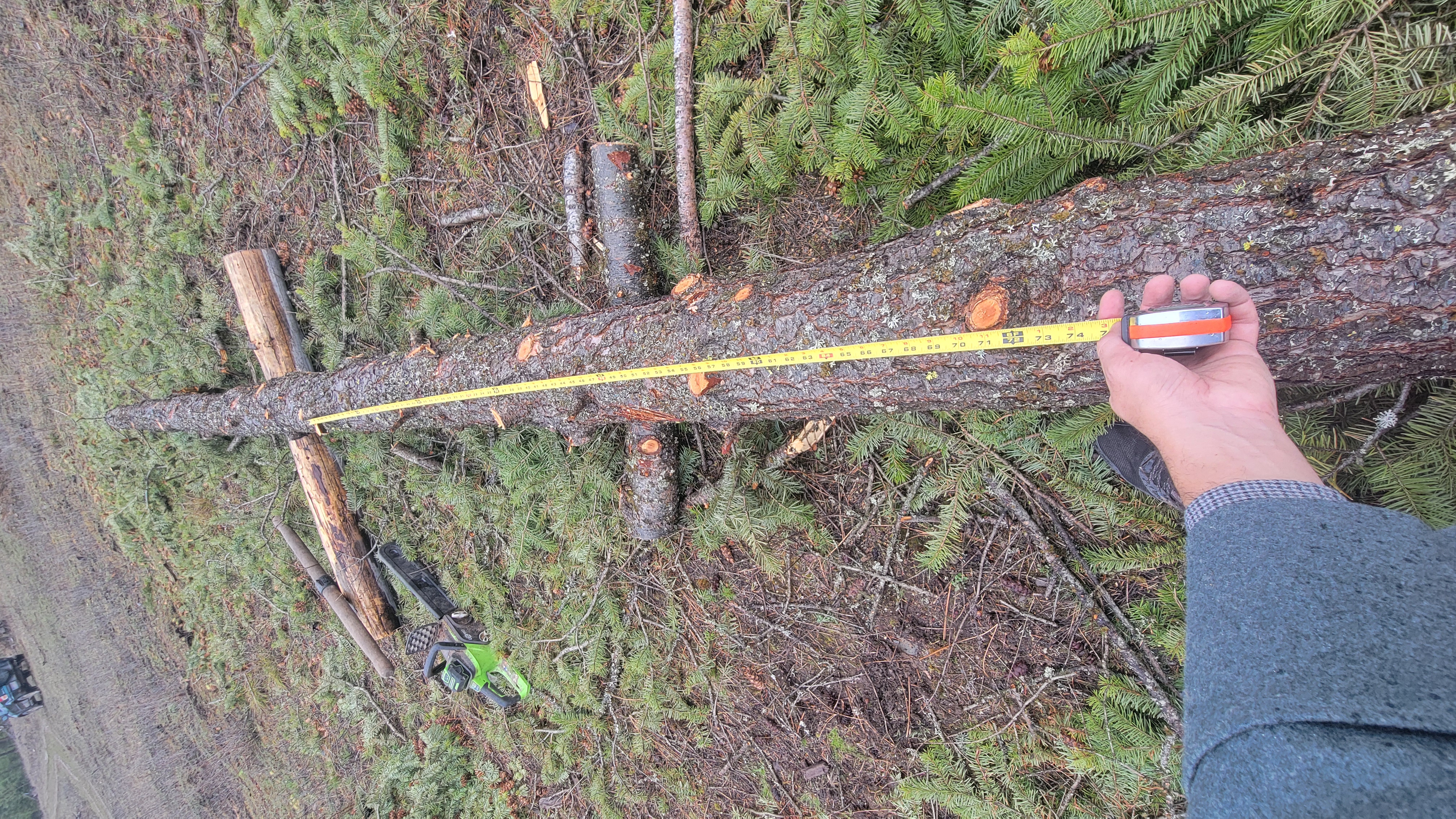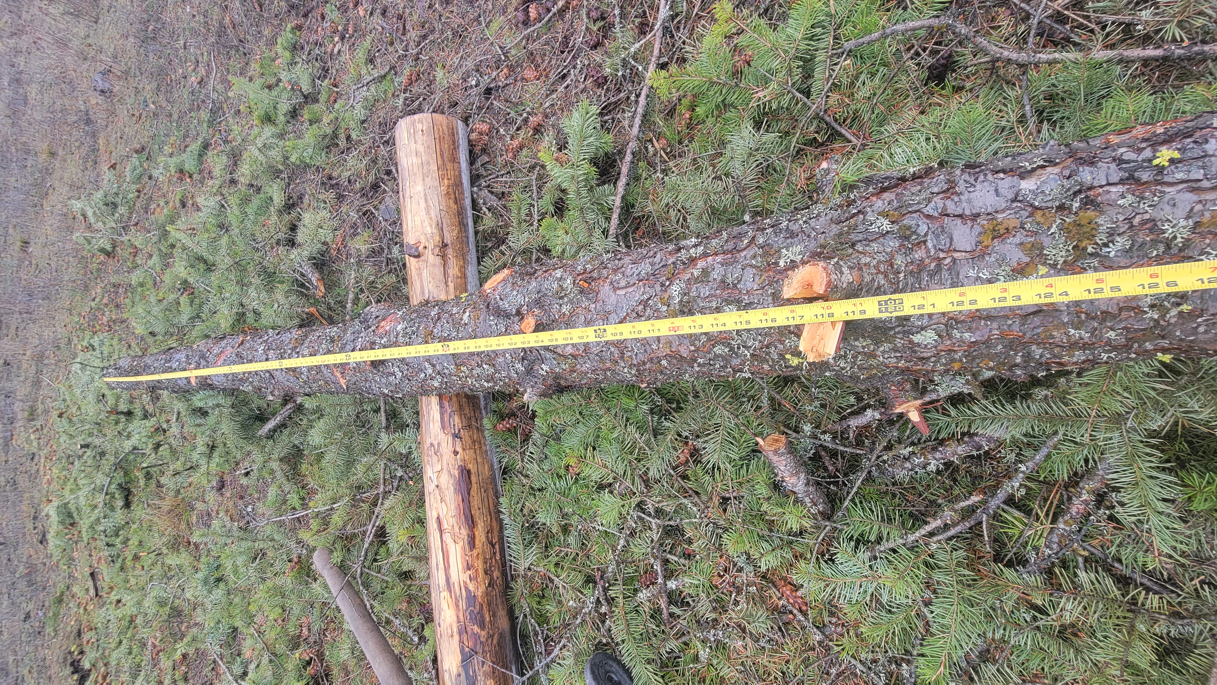 - Your 2 trees before they are peeled, showing they are at least 6" in diameter at the fat end and over 16 feet long