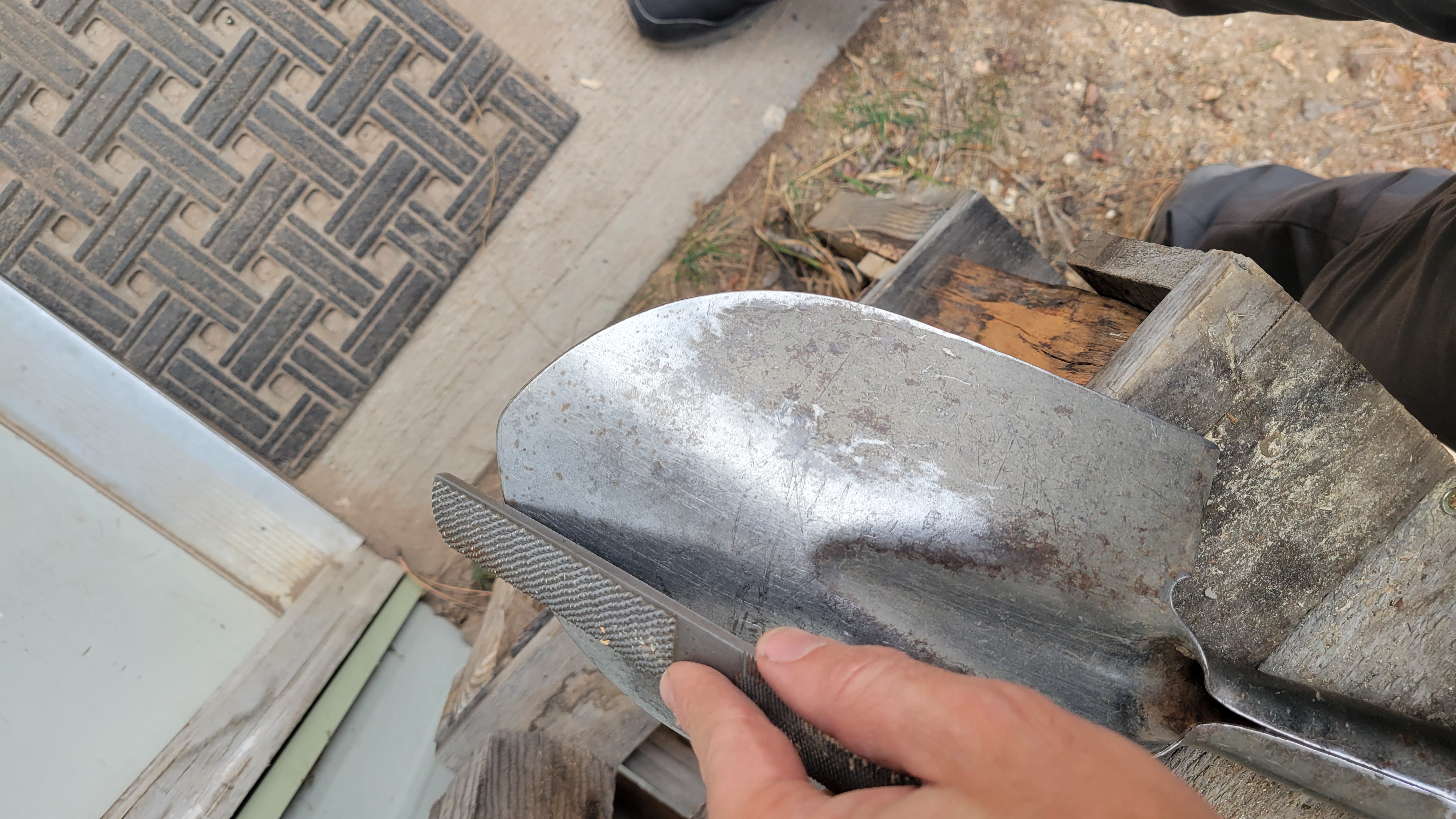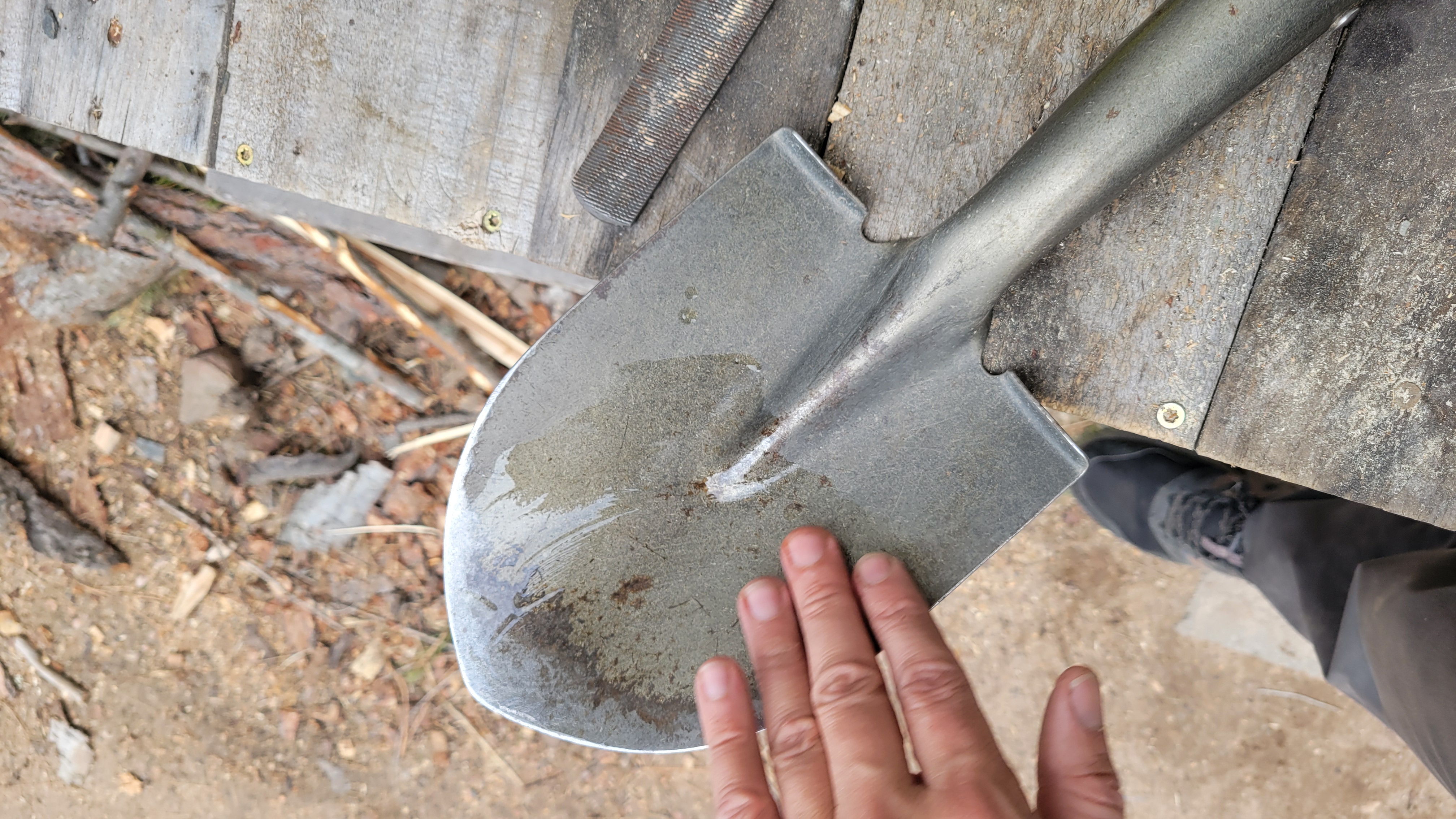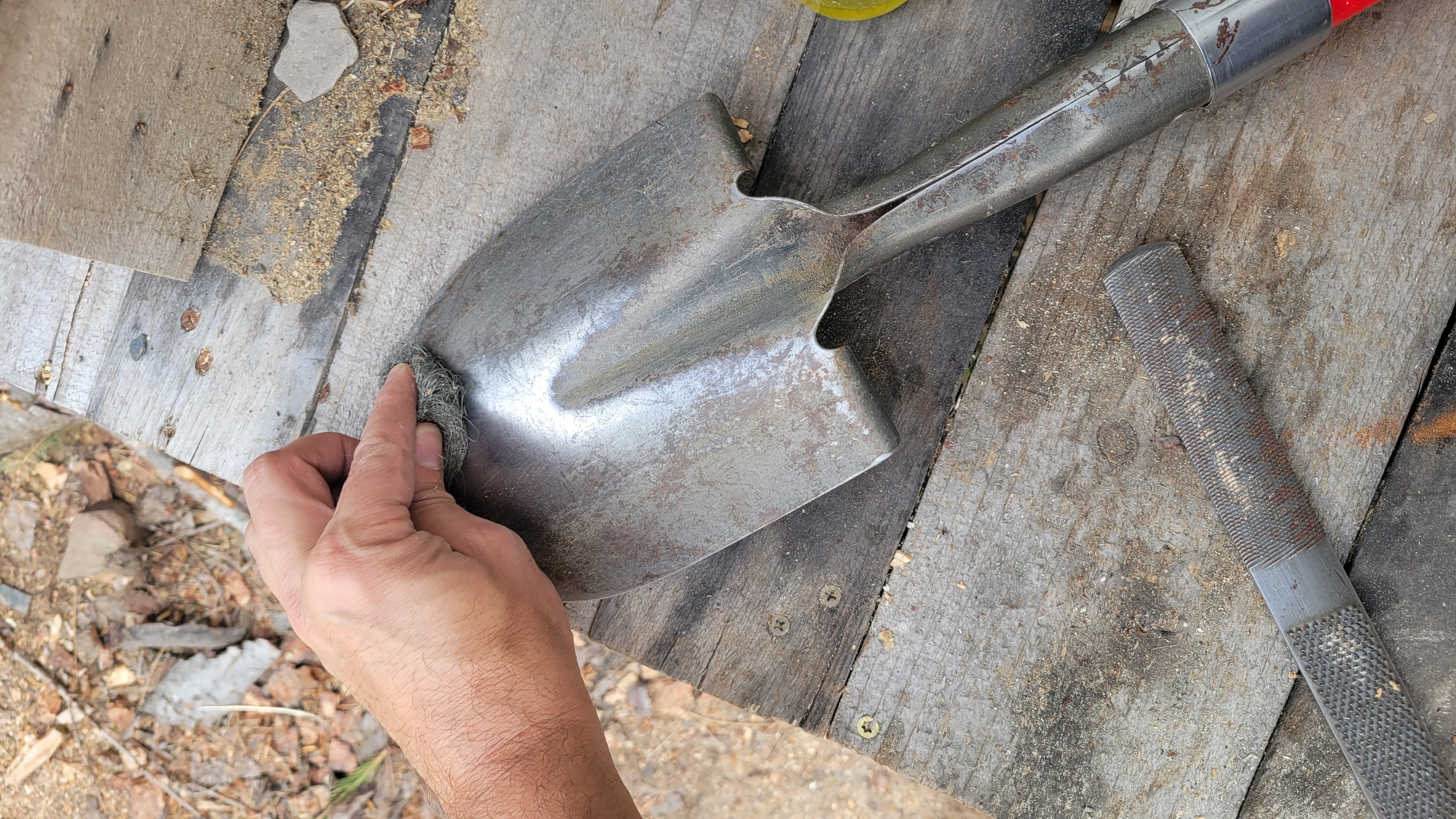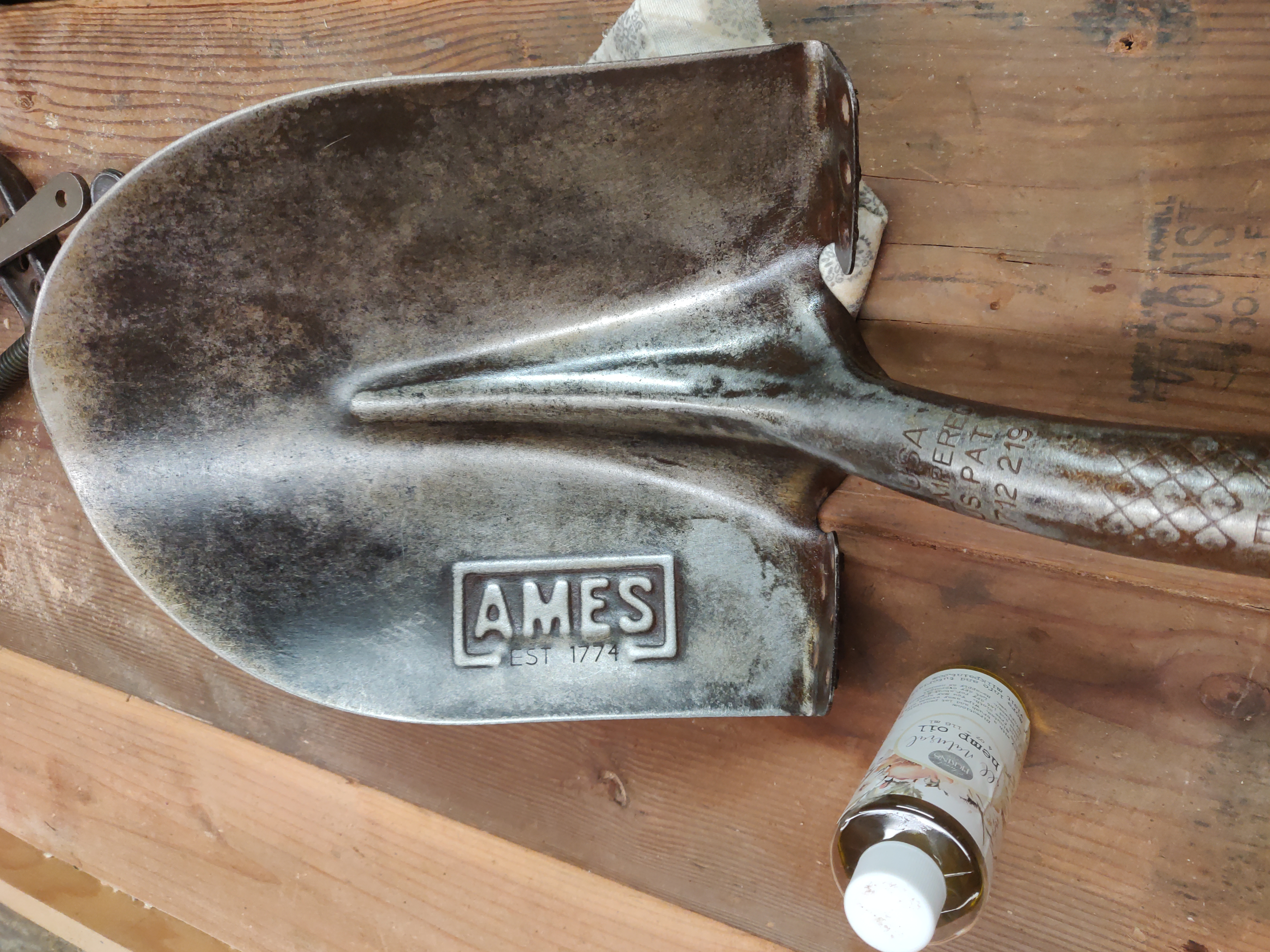 I sharpened the shovel using a file, abraded the rust off using steel wool, then oiled it with linseed oil and a wool cloth.