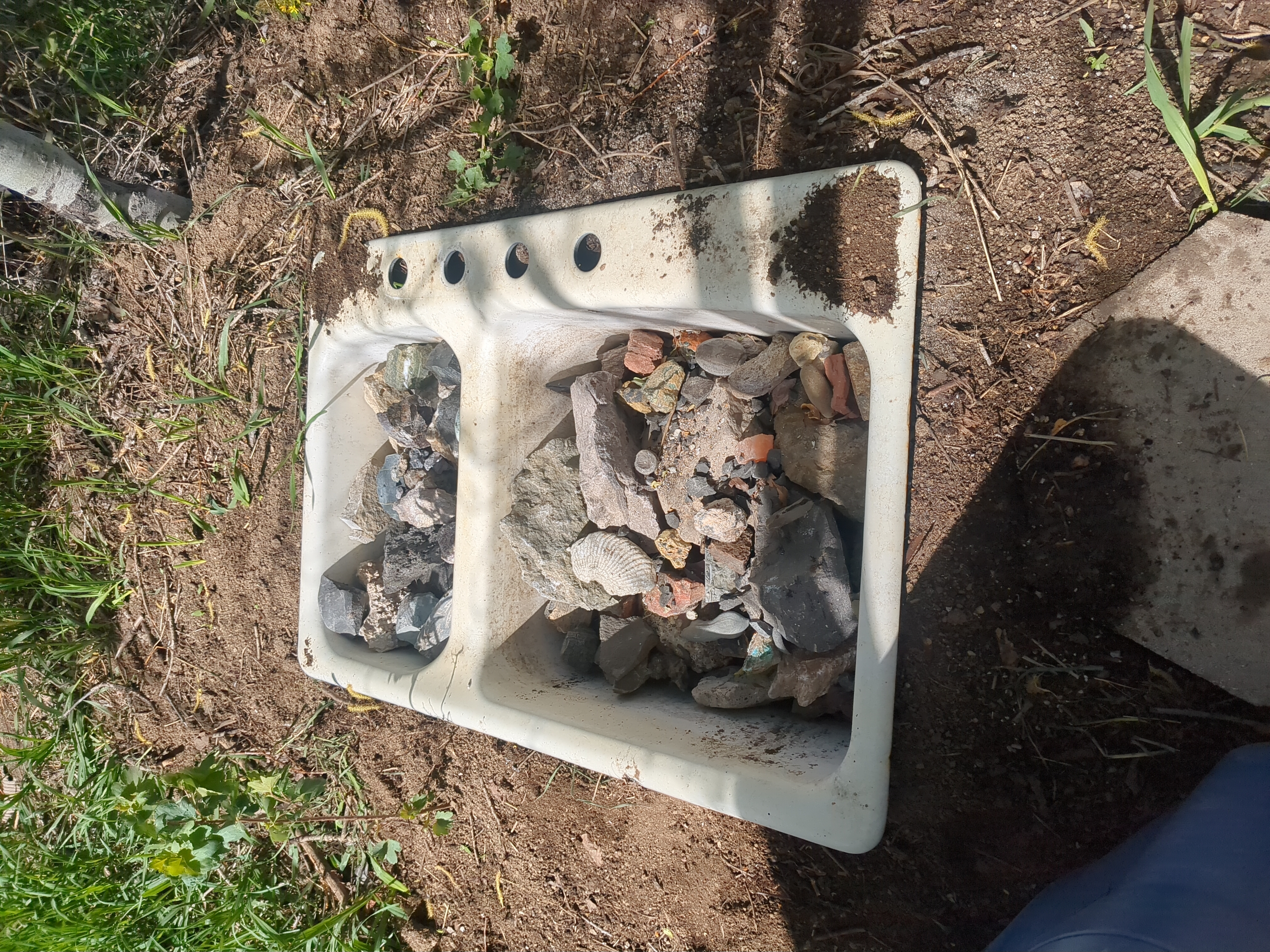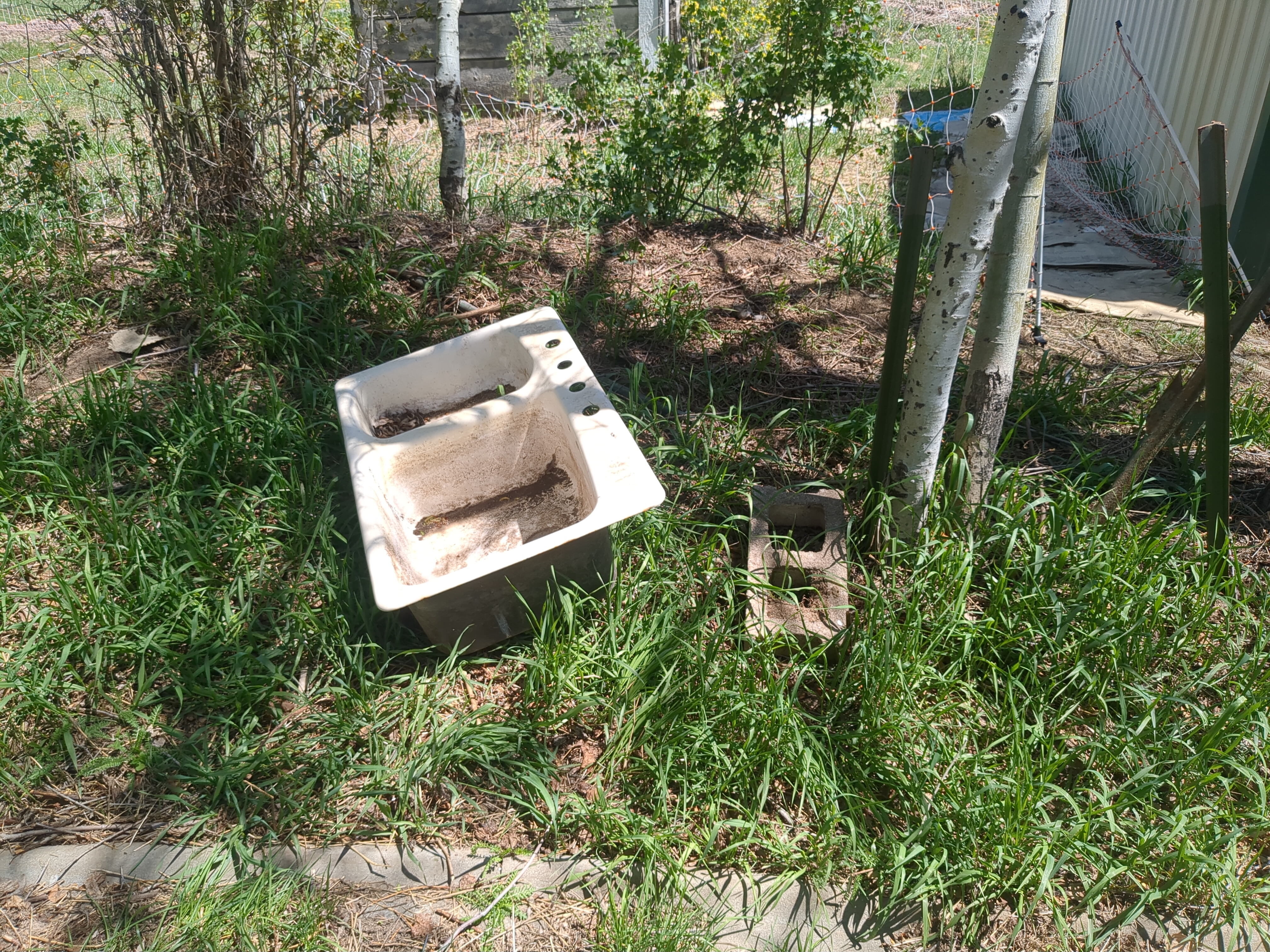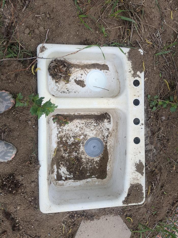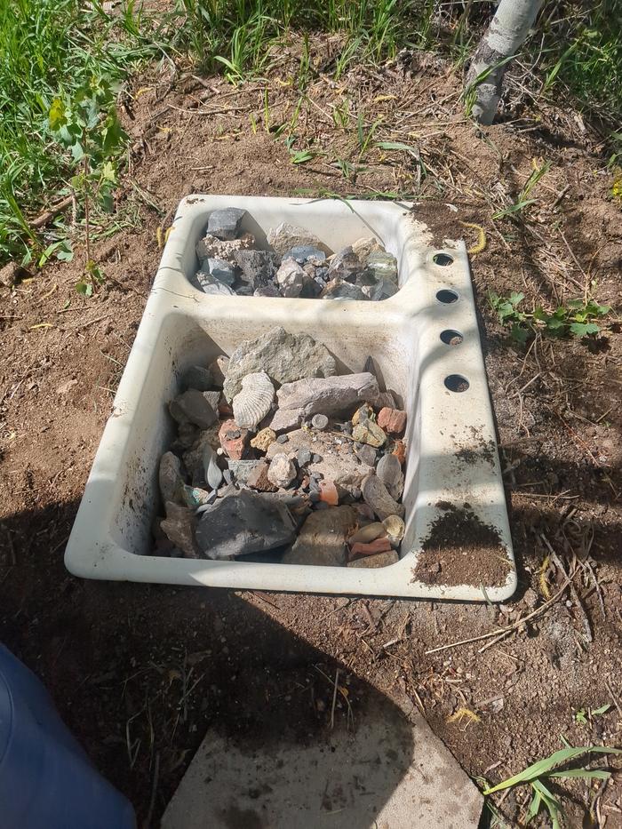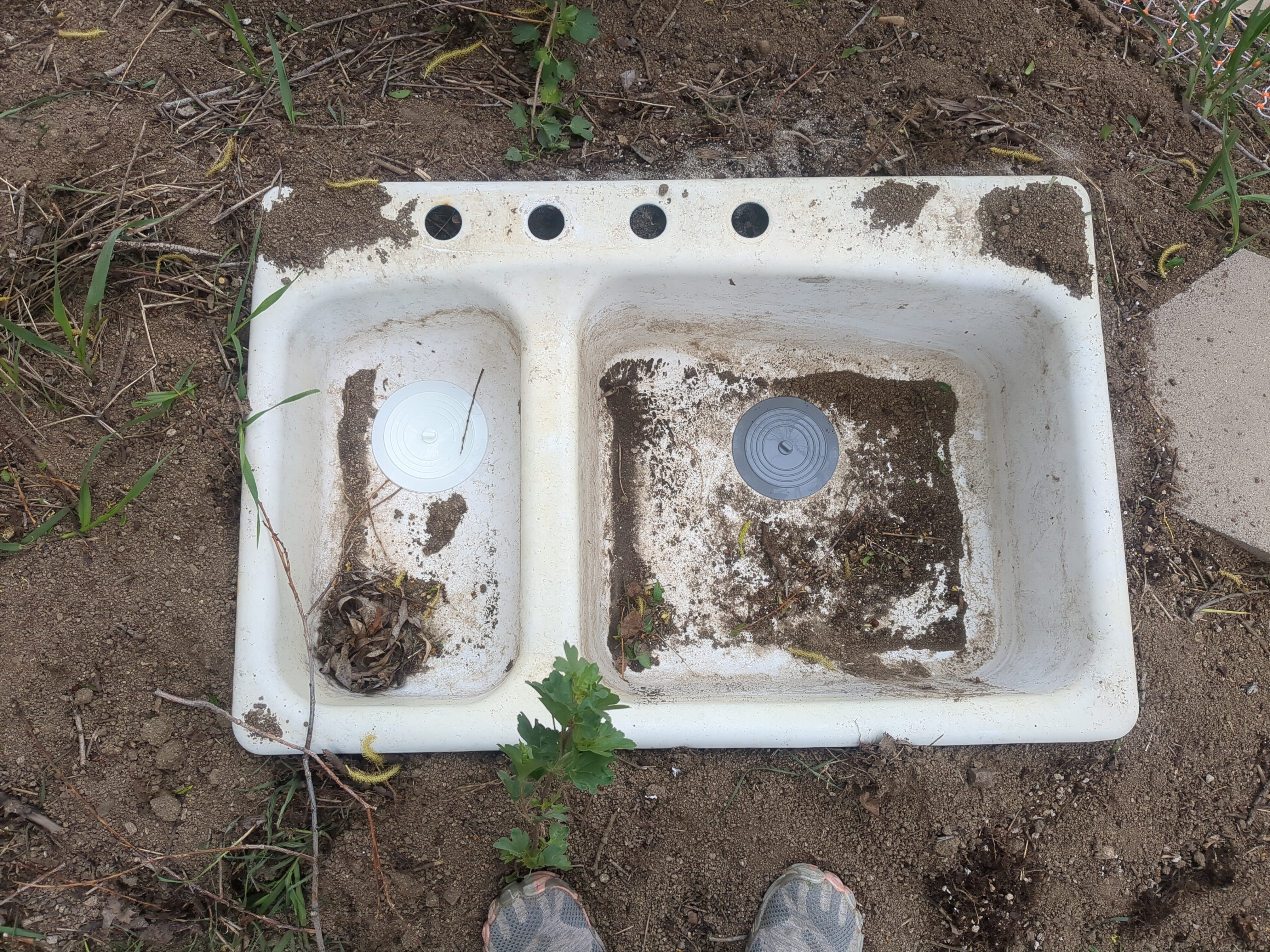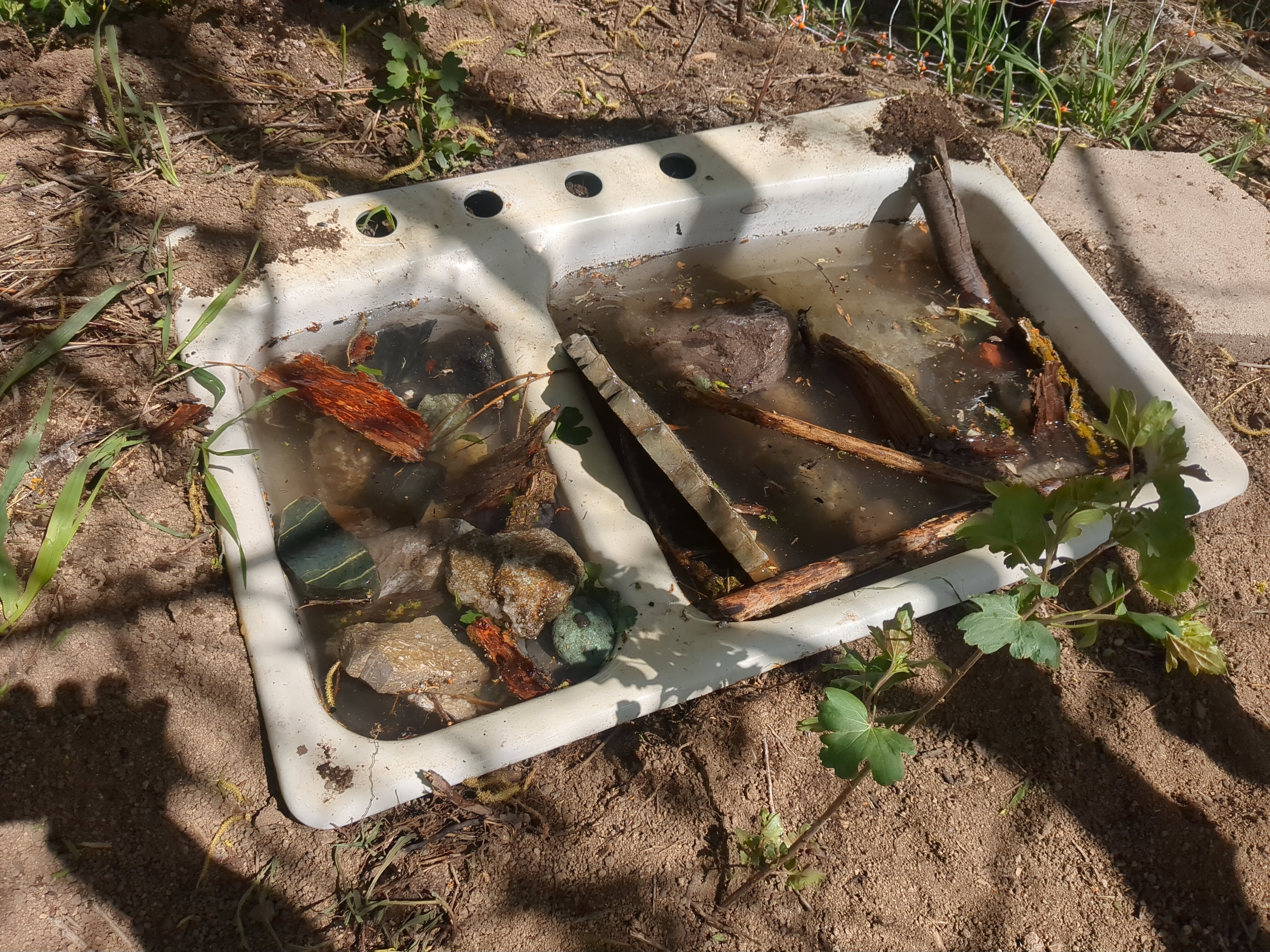The previous owners renovated the kitchen and left the old sink out in the flower beds as a planter. We dug it up and moved it to a new spot. I then buried it and turned it into an insect watering station. If we get another hot dry summer, I may add some sort of water tank to keep it filled. I also had trouble keeping the water in after I added the rocks because they kept breaking the seal on the plugs the holes and these took quite a bit of shifting to keep the seal.