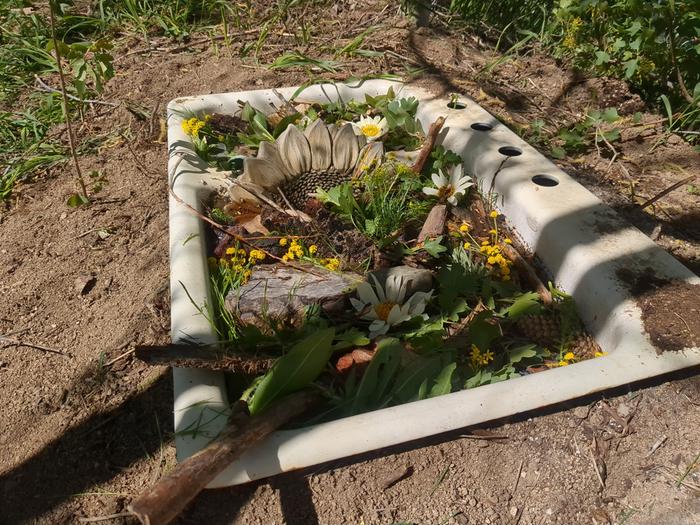 Materials: stones, a small ceramic tile, branches and twigs, moss, a bit of lichen, a fir cone, and flowers.