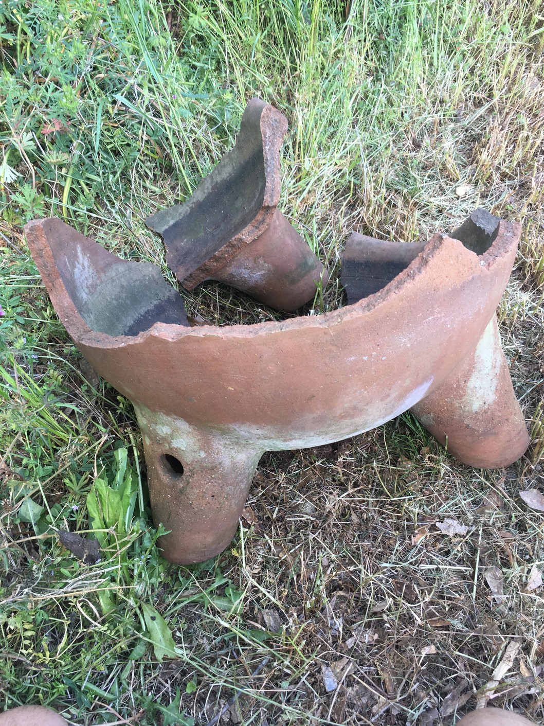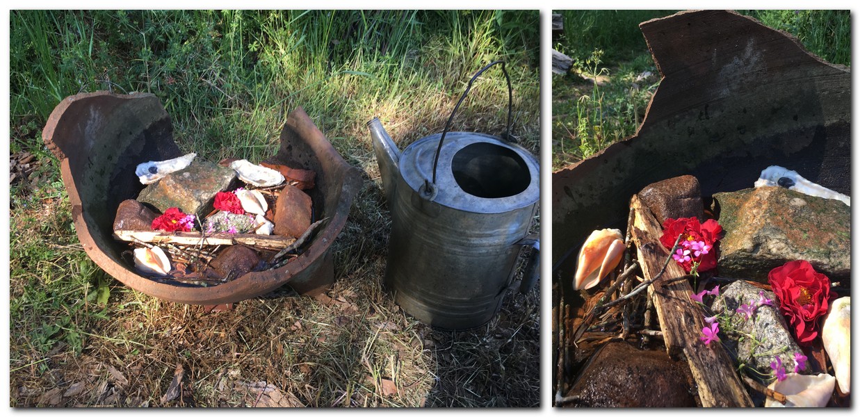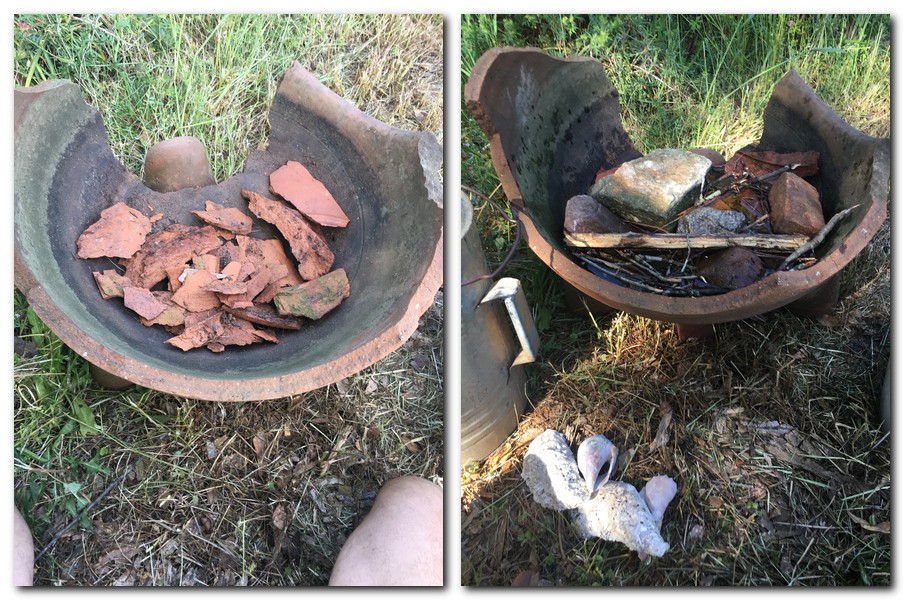 We're having a droughty Spring around here so I set up a bee watering spot using the bottom of a broken chimenea. I added broken terracotta, rocks and sticks and then some shells and flowers to make it a little easier on the eyes. A quick and simple way to support our insect cousins.