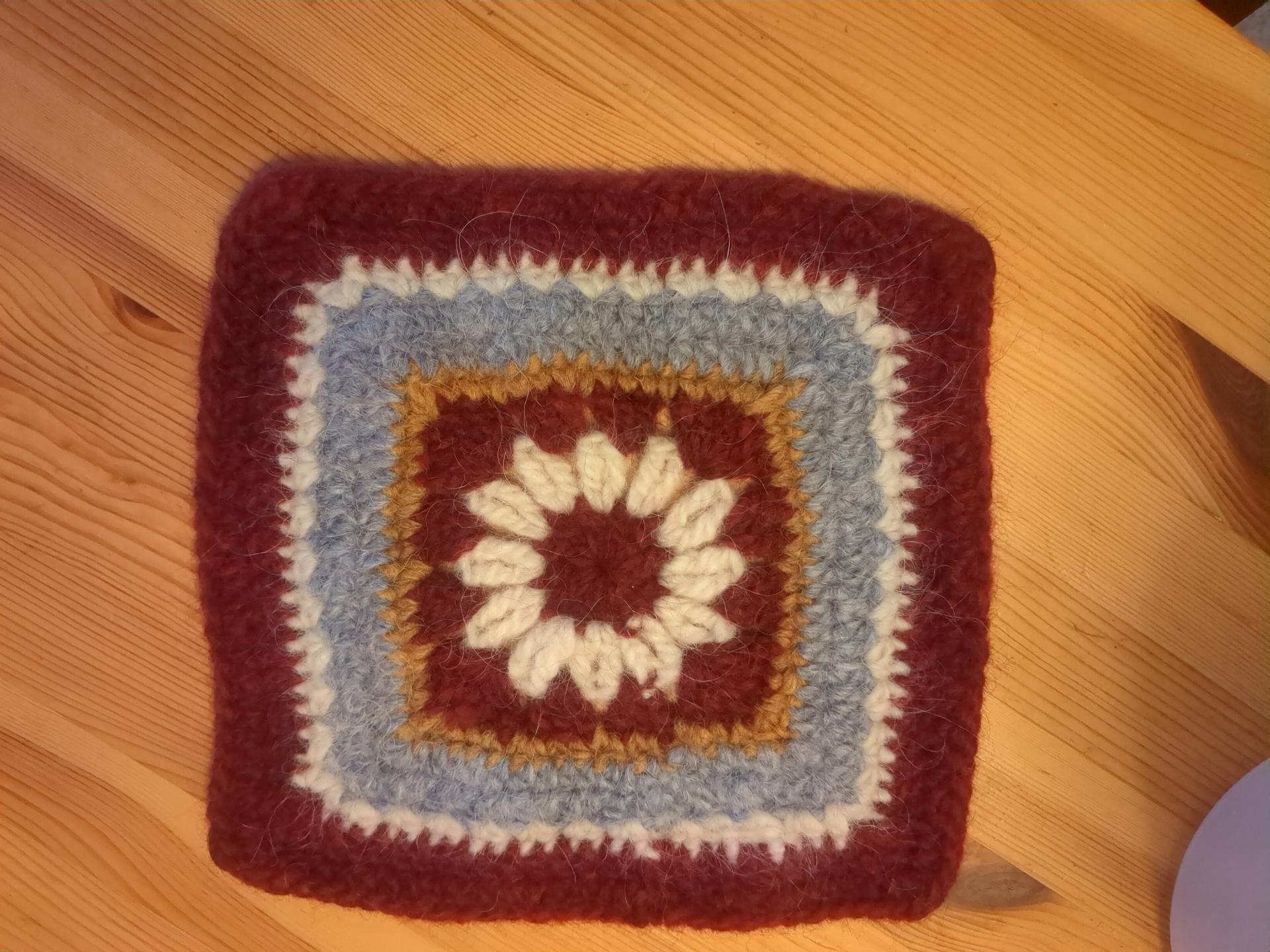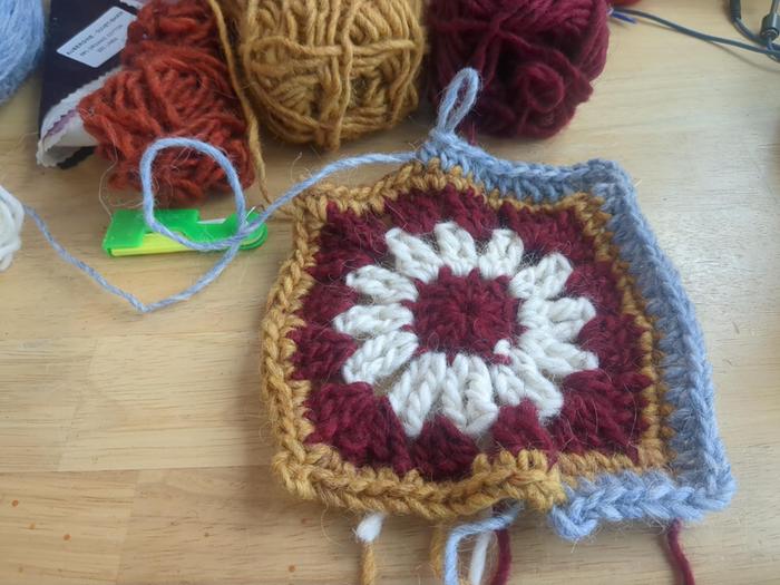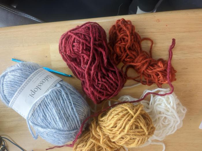 Crocheted a hot pad out of leftover wool yarn. I ended up not using the orange. I mixed up the textures and colors a bit and then I felted it a little.