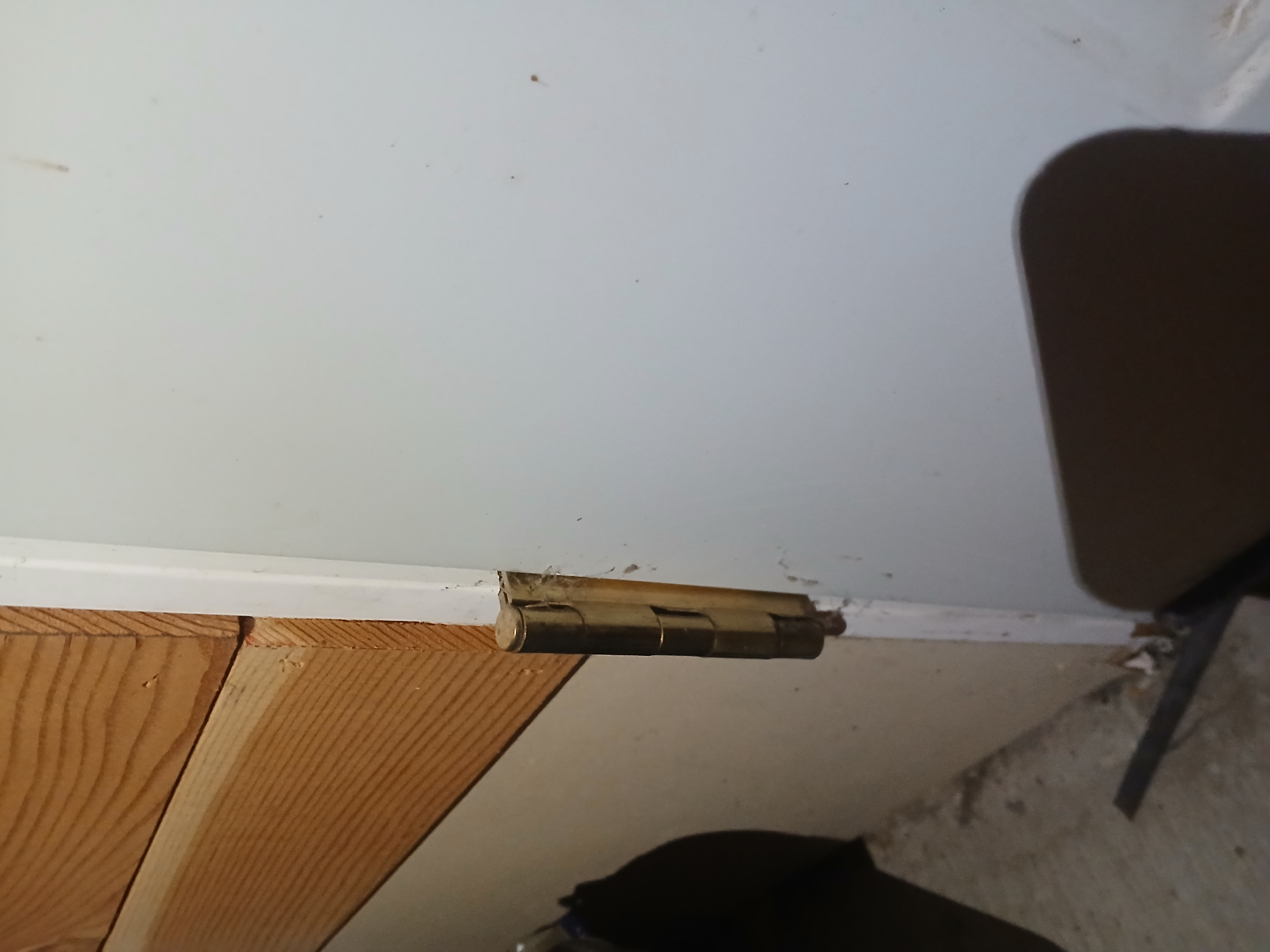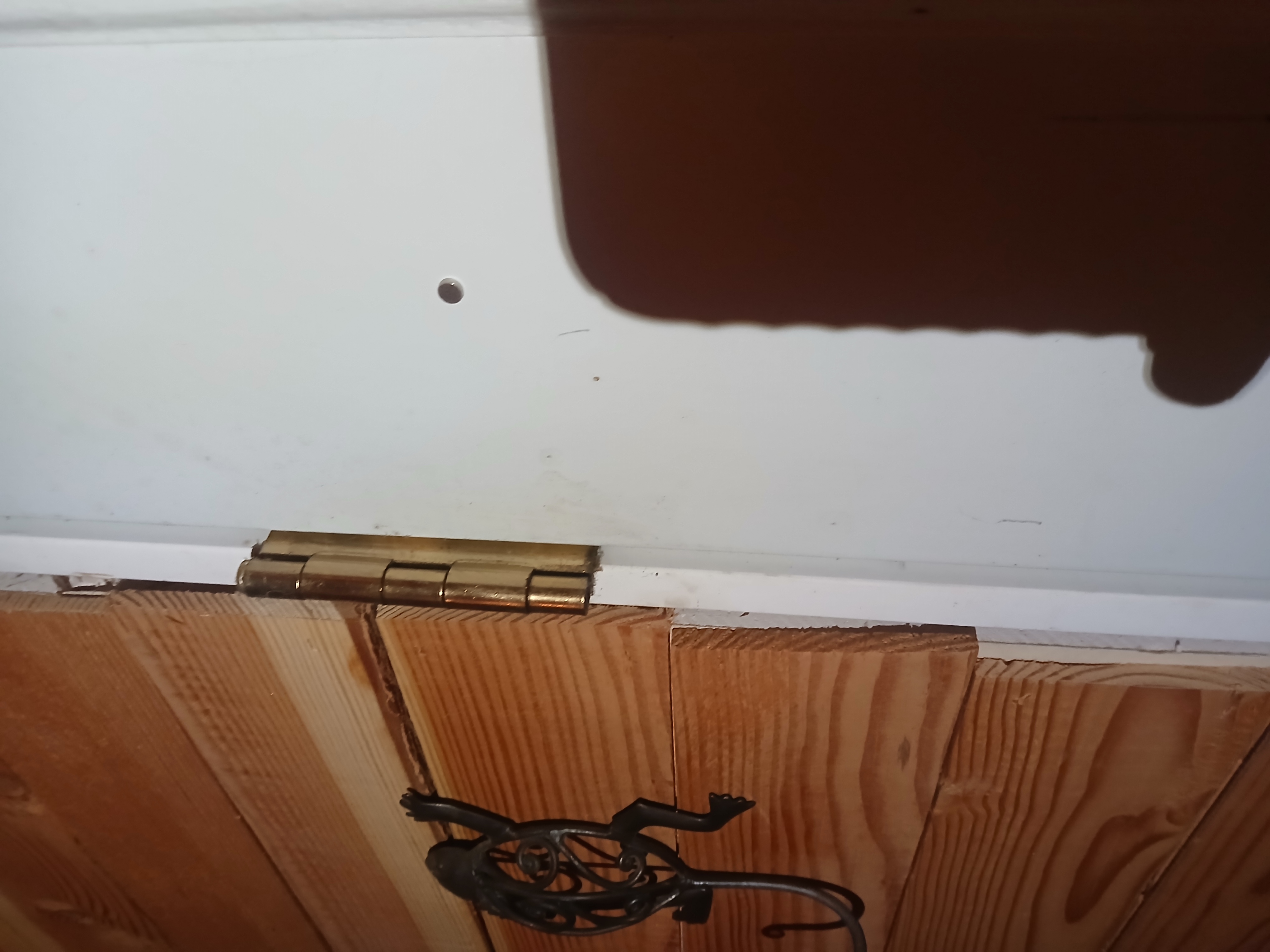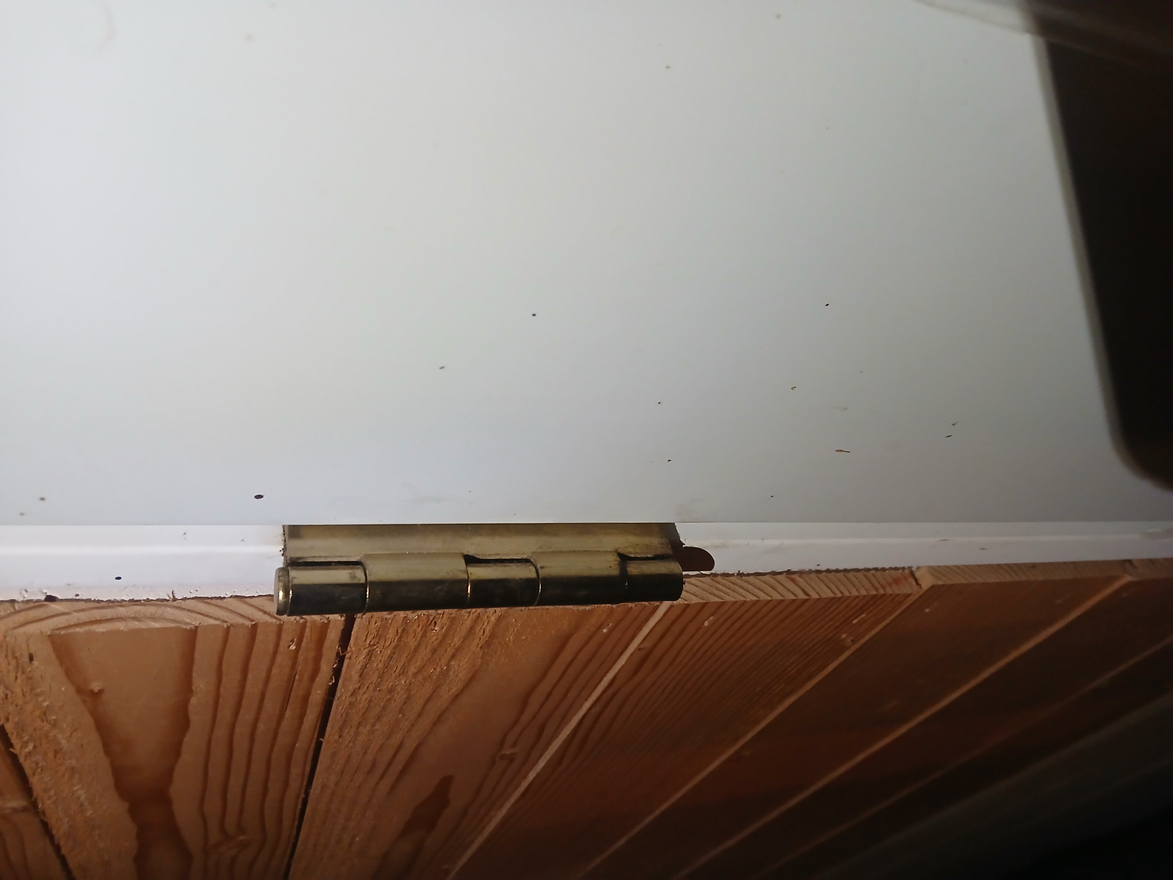 This door has only two hinges. The pin on the bottom hinge is a little loose.