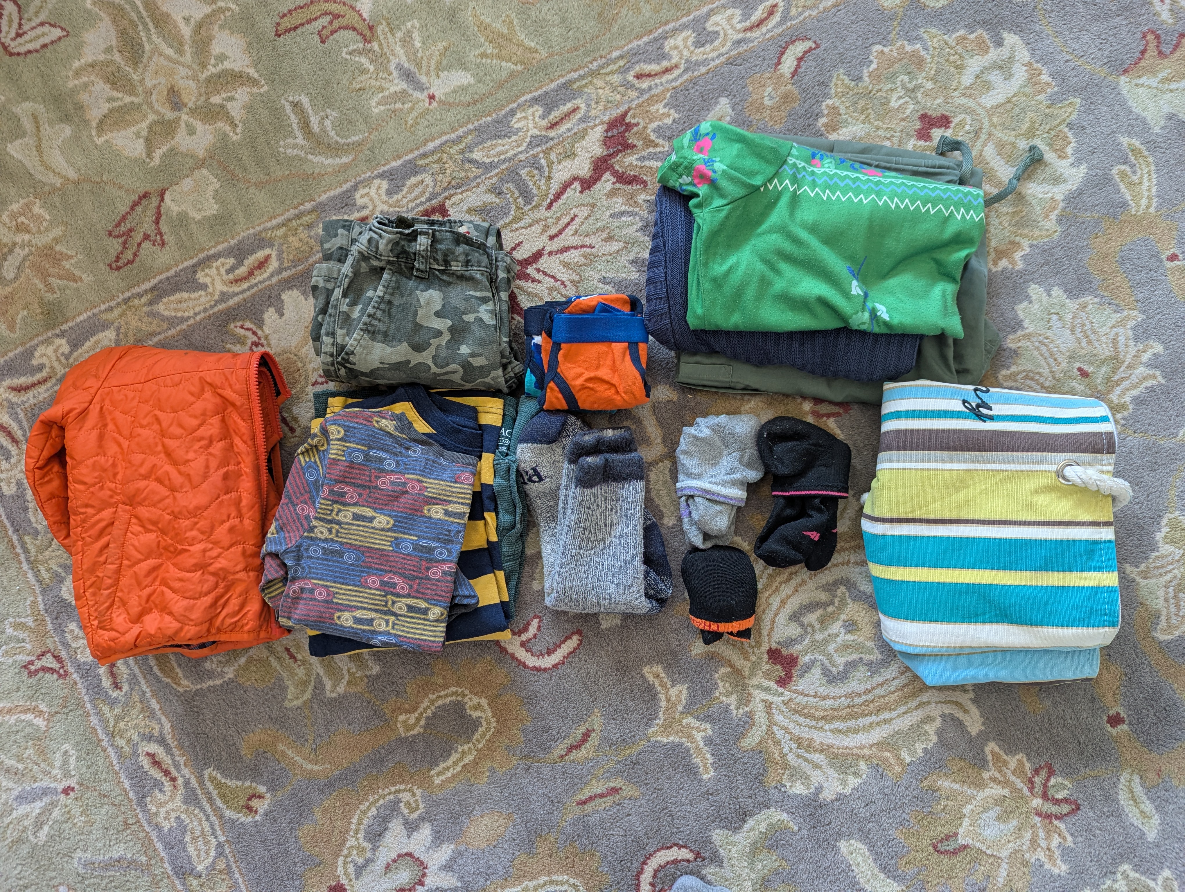 1 nightgown, 2 pj bottoms, 5 pants/shorts, 3 tshirts, a sweatshirt, a dress, 3 washcloths, 6 undies and 4 pairs of socks in total.