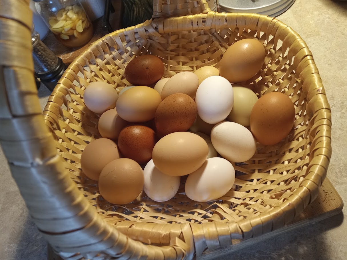 Here is some eggs from my flock of 28 laying hens and 2 beautiful roosters. Some are in there retirement age and don't lay nearly as often as they used to but I swear they keep the peace and teach my younger gals what to do and how to behave! We get about 20 eggs a day right now.