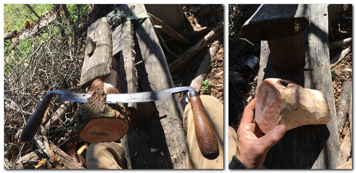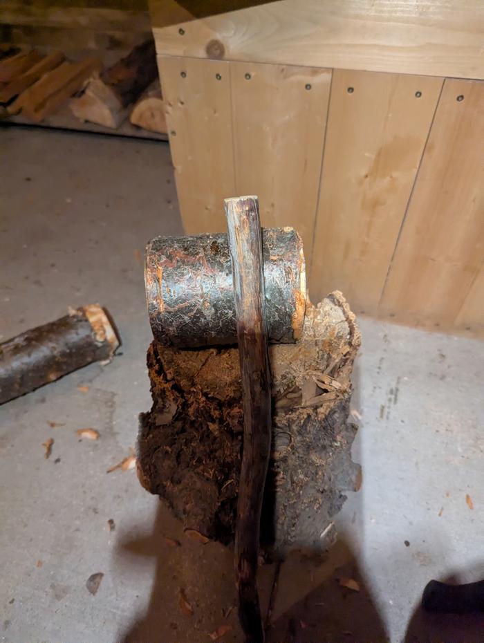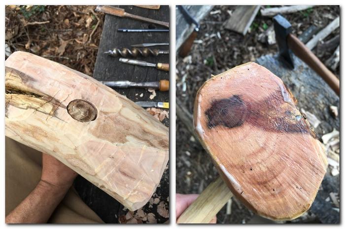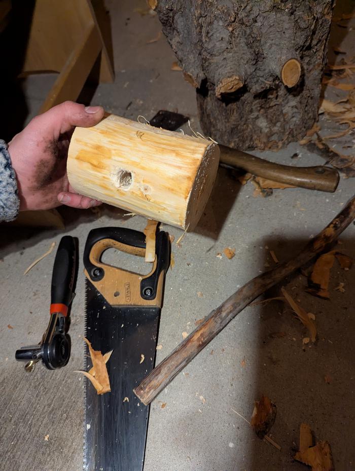 Howdy, Skippers! Good day to build a compound mallet day, eh? I used a dry walnut branch for the handle, and a wet spruce trunk for the head. Wish I had hard wood for the head, but alas! Spruce will work. How long will it take to dry? When is a good time to start using it?