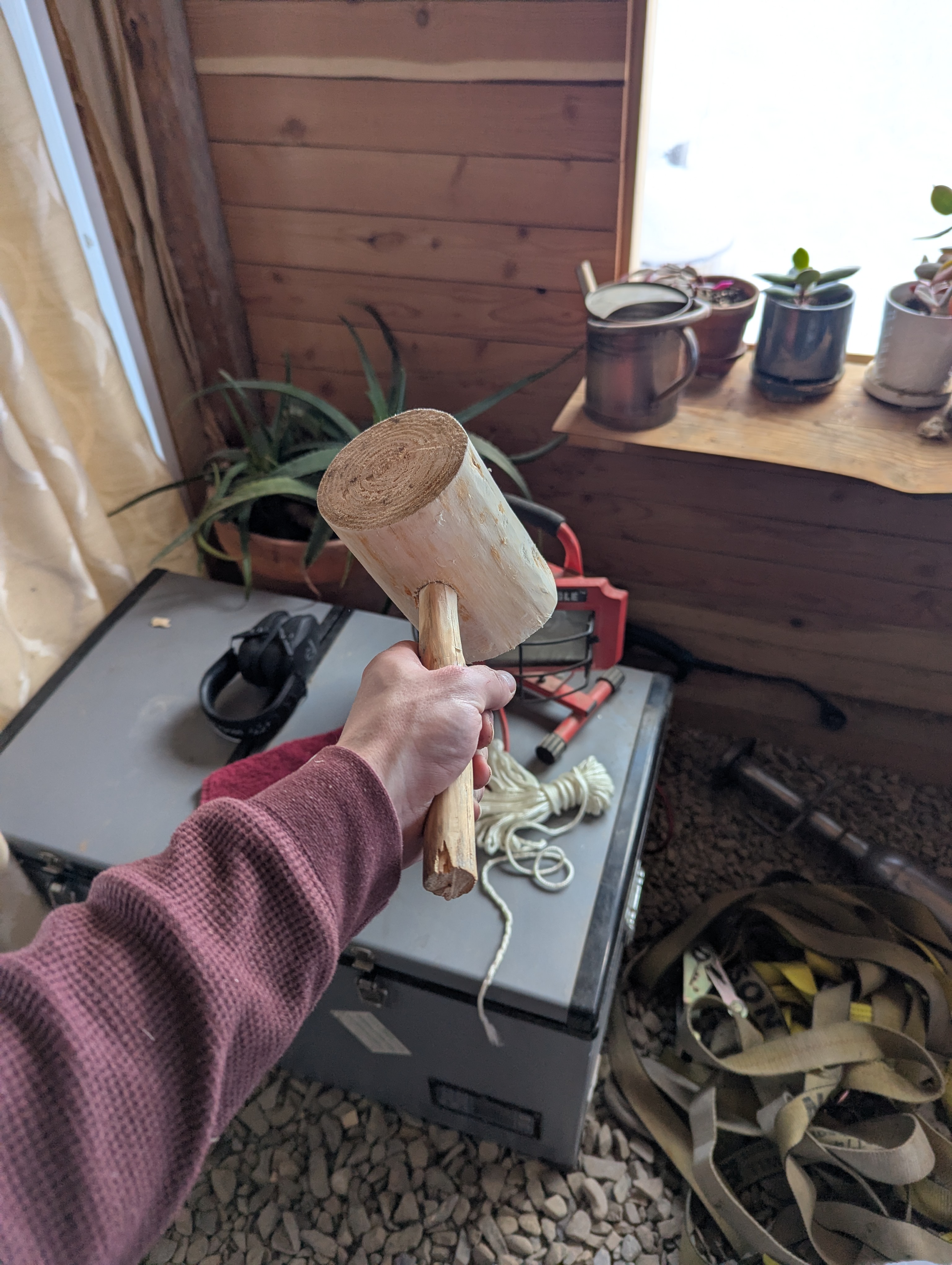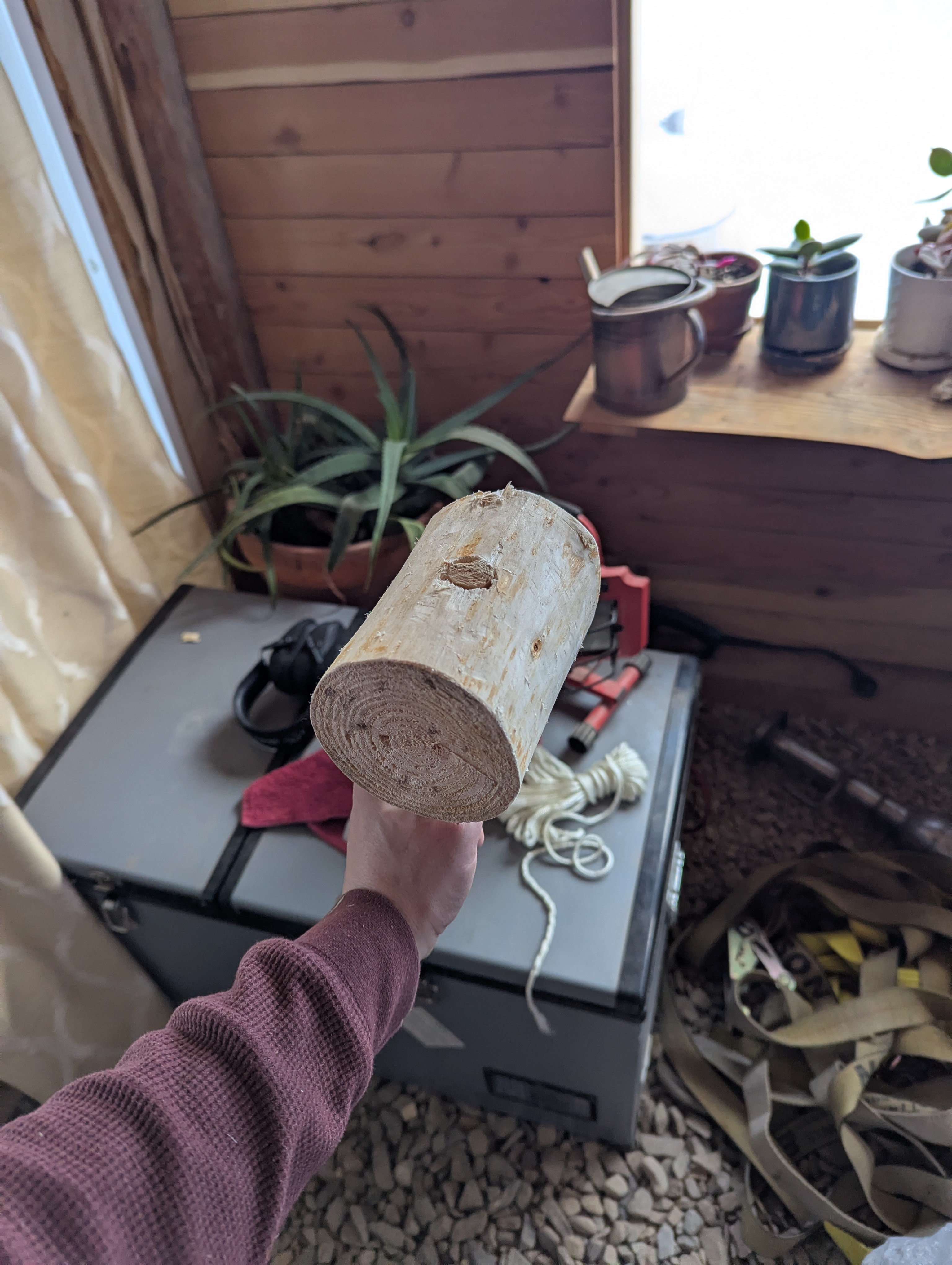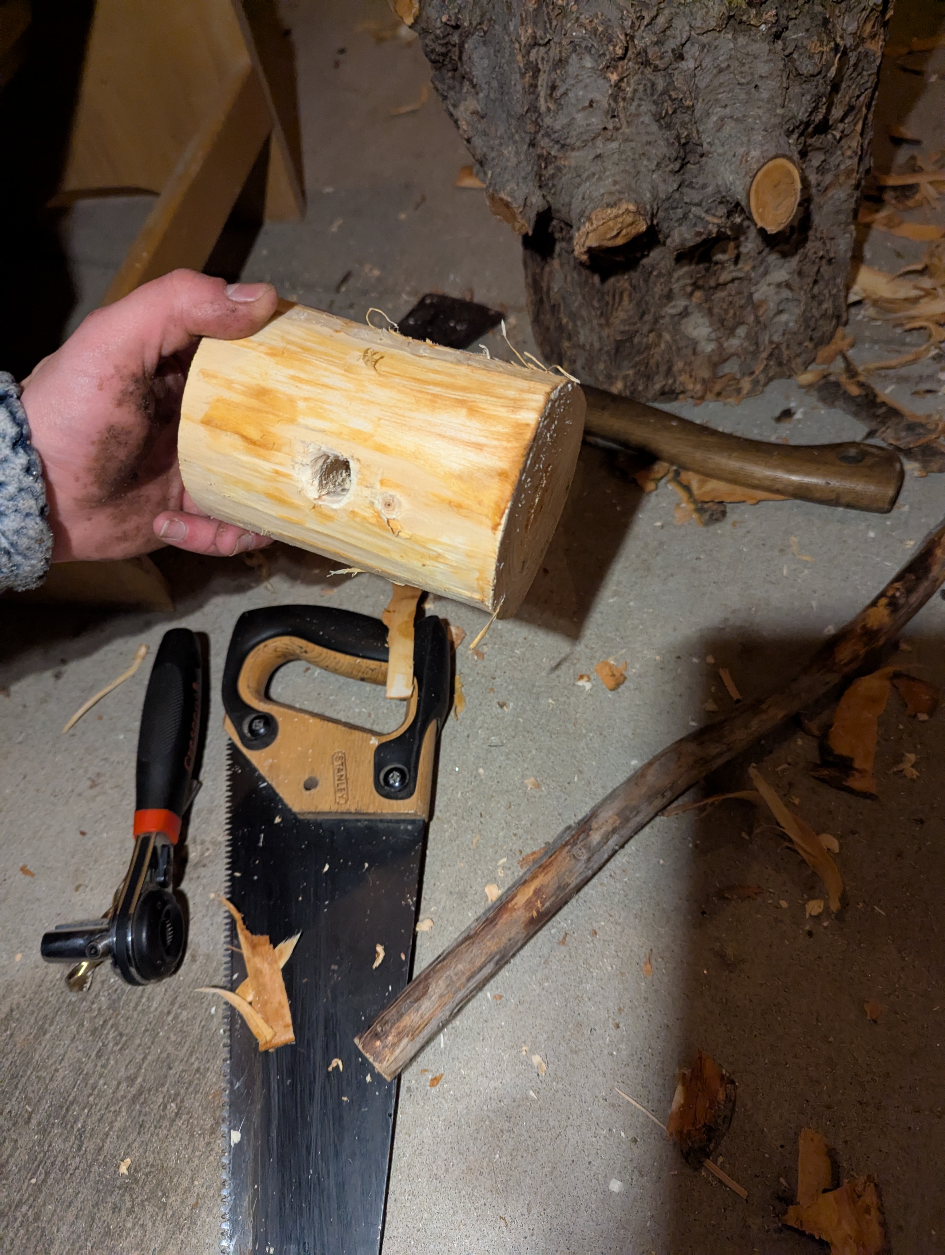 First, I picked a log and stripped it. Then I started looking for a handle - I was all sorts of out of order but I learned a lot about woodworking. I wanted a strong mallet, so I picked knotty wood. And then I (over 2 hours) put it together. . . And it broke. So I threw a fit. Walked away, got some dinner, then talked to someone who suggested instead of starting over, we pound out the broken handle and start a new handle. Unfortunately, I didn't get a picture at this point! So my before handle is different than my after handle. But I did replace the handle and it works much better! My intention is to give this to my son - which is why the handle is a little small for my hands.