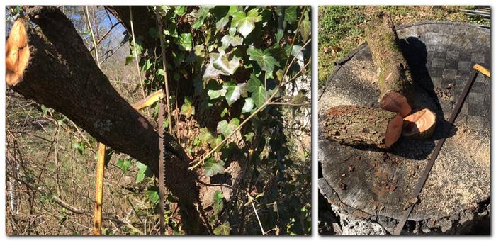 Made the head of this mallet out of a dogwood limb that was broken by a another tree falling on it, wood is still green with a couple weak sprouts. I was hoping pruning it off with a clean cut will help it heal over but sadly on closer inspection I think the tree is on its way out. Next I cut out a segment to be the mallet head and took the bark off at the shaving horse and chamfered the faces. I have some billets of wood stored away for making handles that are all well seasoned by this point, I selected a pretty much ready to go piece of what I think is hickory. Bored the hole with a scotch-eyed auger and then made it into an oval to fit the handle with a small array of gouges. Once the handle was driven into the head I cut it flush with the hatchet and reshape the head to take off some of the twist. I rubbed old lard over the faces to slow down uneven drying in hopes of reducing checking. Made another one piece mallet with the rest of the limb. I really like dogwood for these sorts of things, it's dense and heavy but with a tight smooth grain that resists wear. Good for more refined uses too but is much harder to work once dried.