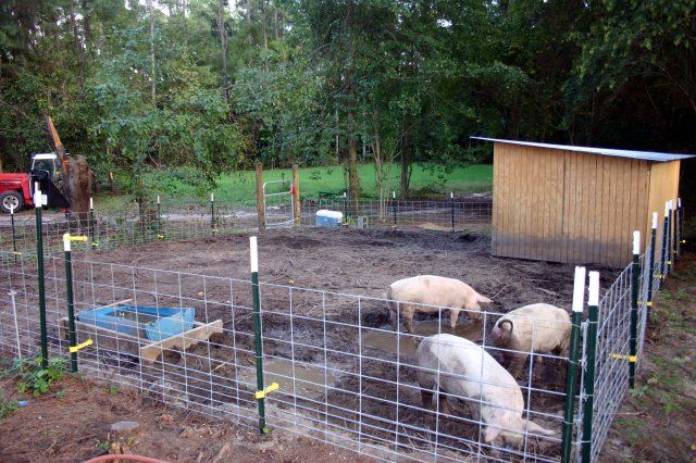 The Pig Option: Justin Rhodes has a video out on youtube about raising pigs in a small space which he calls the "pigport". Nothing too crazy. And we have considered something a little bigger to add a wallow. Carports are expensive, but we could build them a little wood shelter, and pigs are not fussy; or prone to get killed by raccoons and birds of prey. I already have the posts for the enclosure, I can use woven fence for it. Pig wire is half as expensive as sheep wire, and I would need only a half as much of it. Justin uses deep bedding. What I can get is leaves and hay. Still working on finding woodchips. The watering system could harvest roof rain from my feed shed. The feed and water are right there. No carrying feed and water out to a distant pasture system.