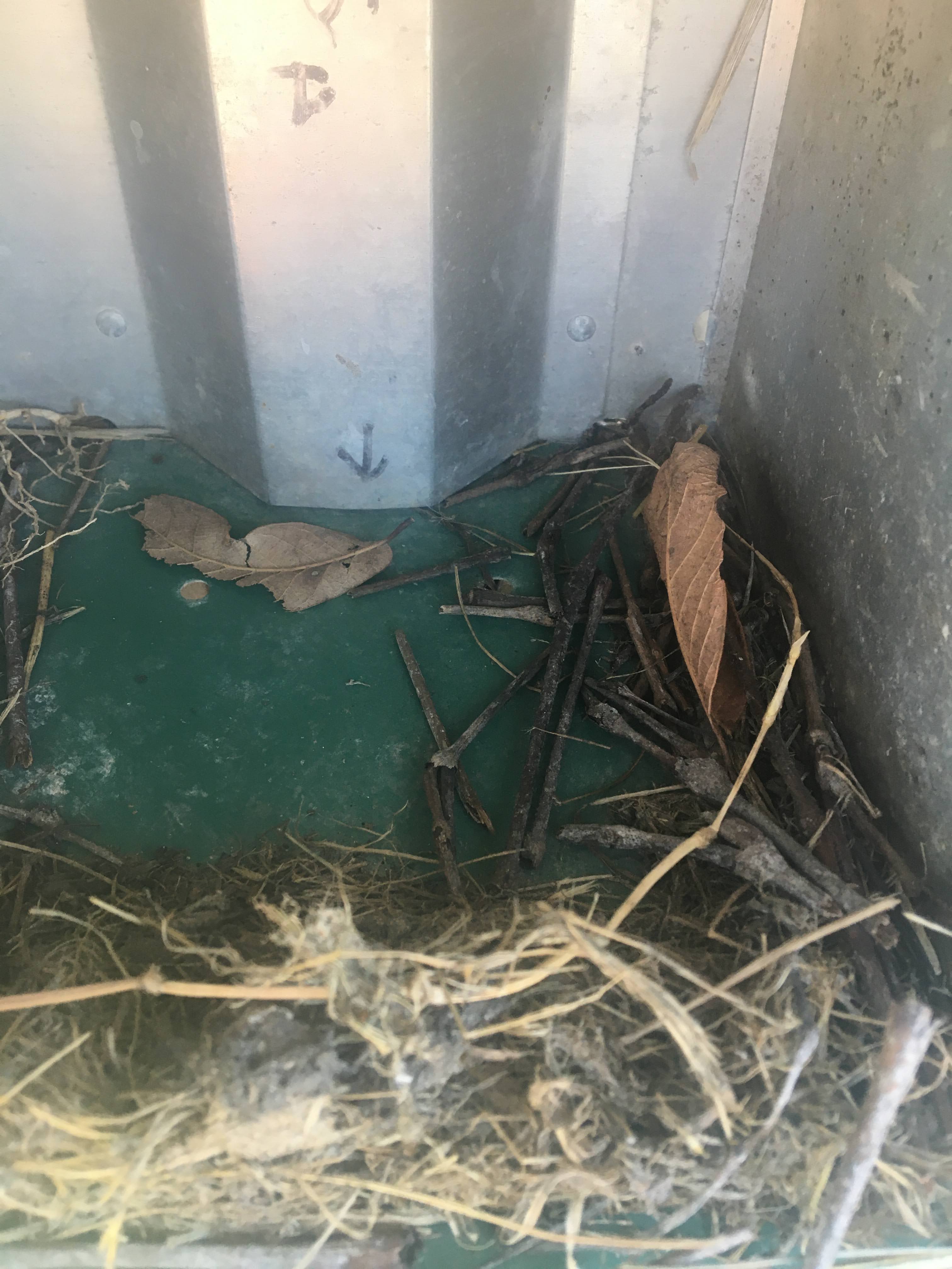 Week 1: Found the beginnings of nests in three of the boxes. Lots of sticks and dried grass, and a little mud to hold them together.