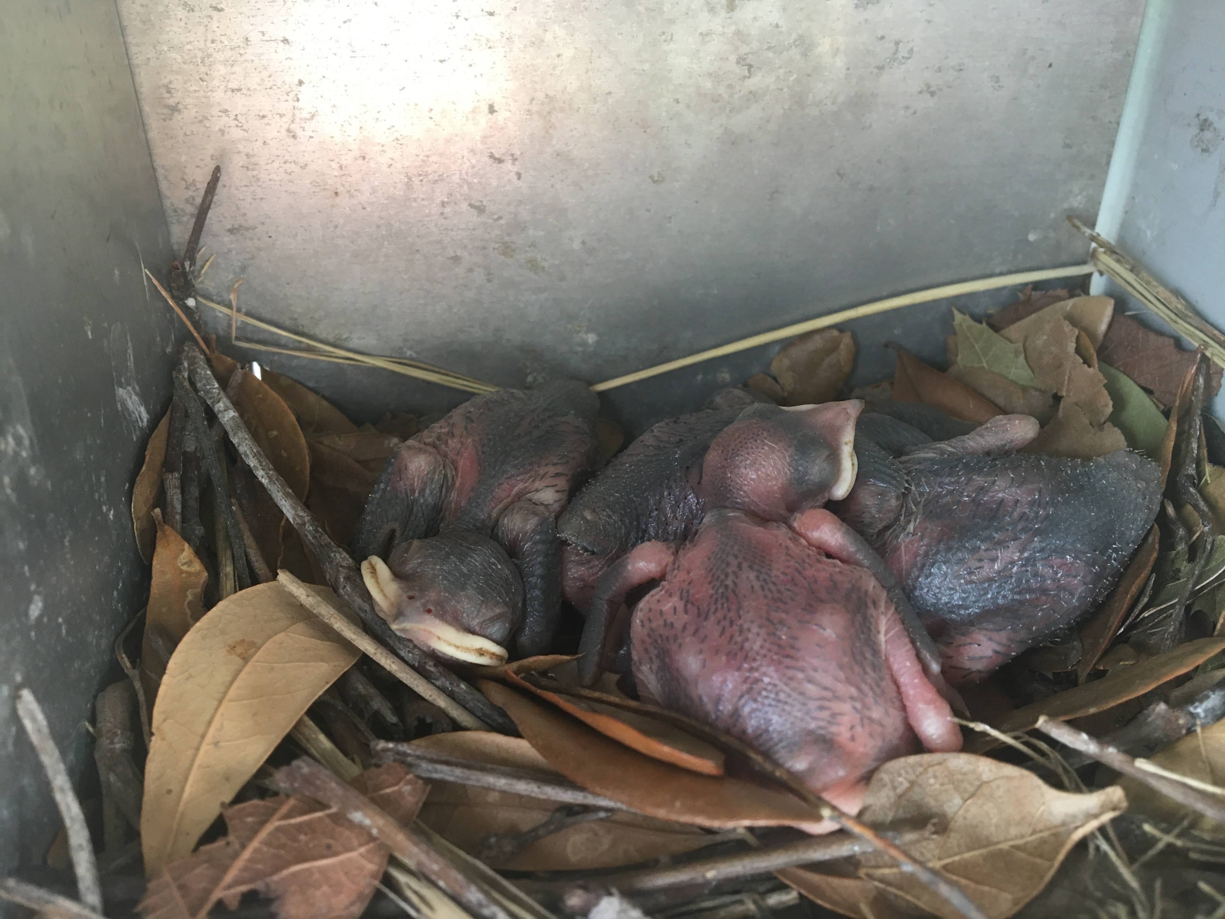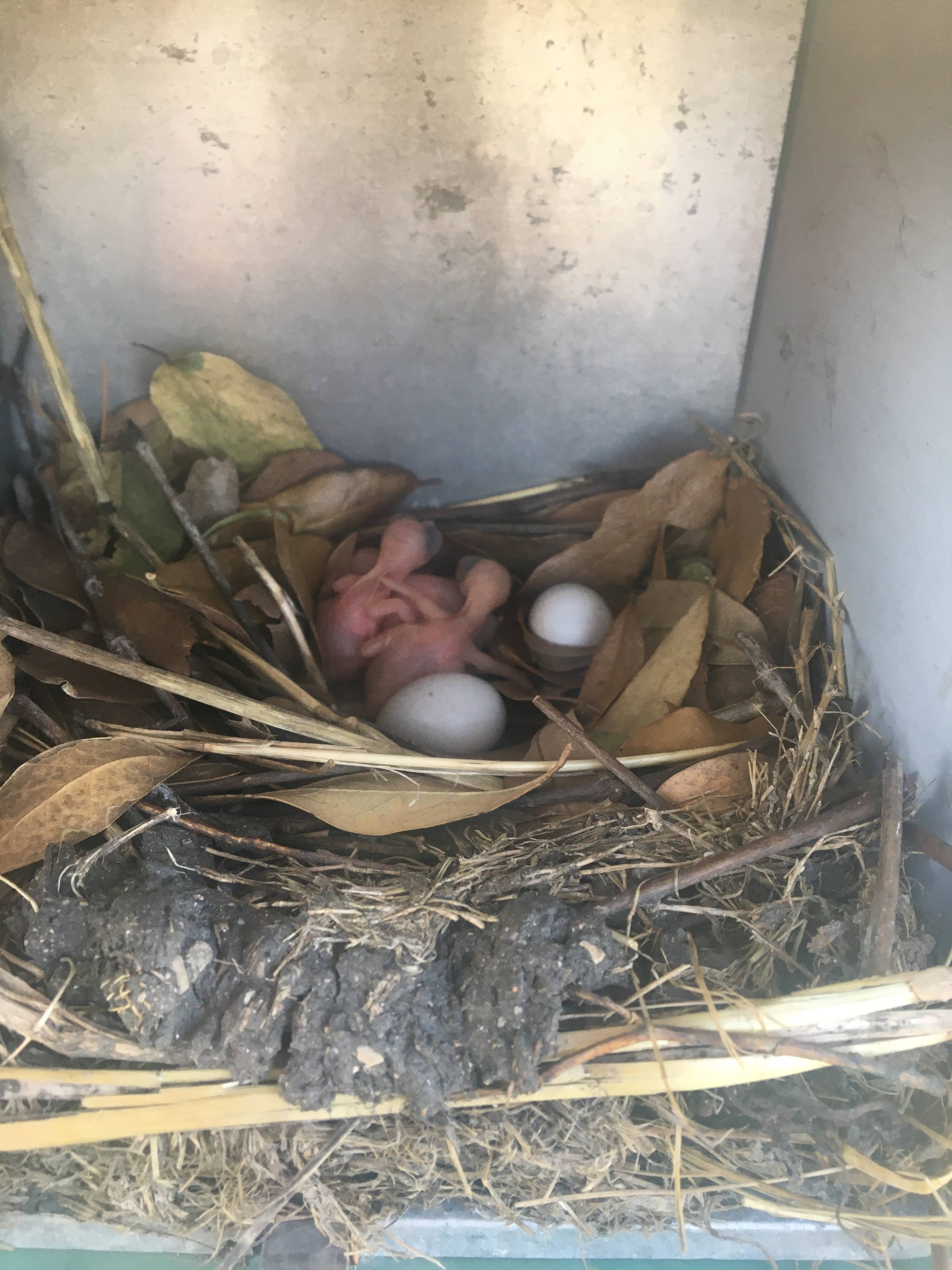 Week 6: All five eggs in the first nest are hatched. Babies are starting to darken in color. Second nest has three hatched babies! One other nest is now lined with leaves and ready for eggs, and another nest has eggs.