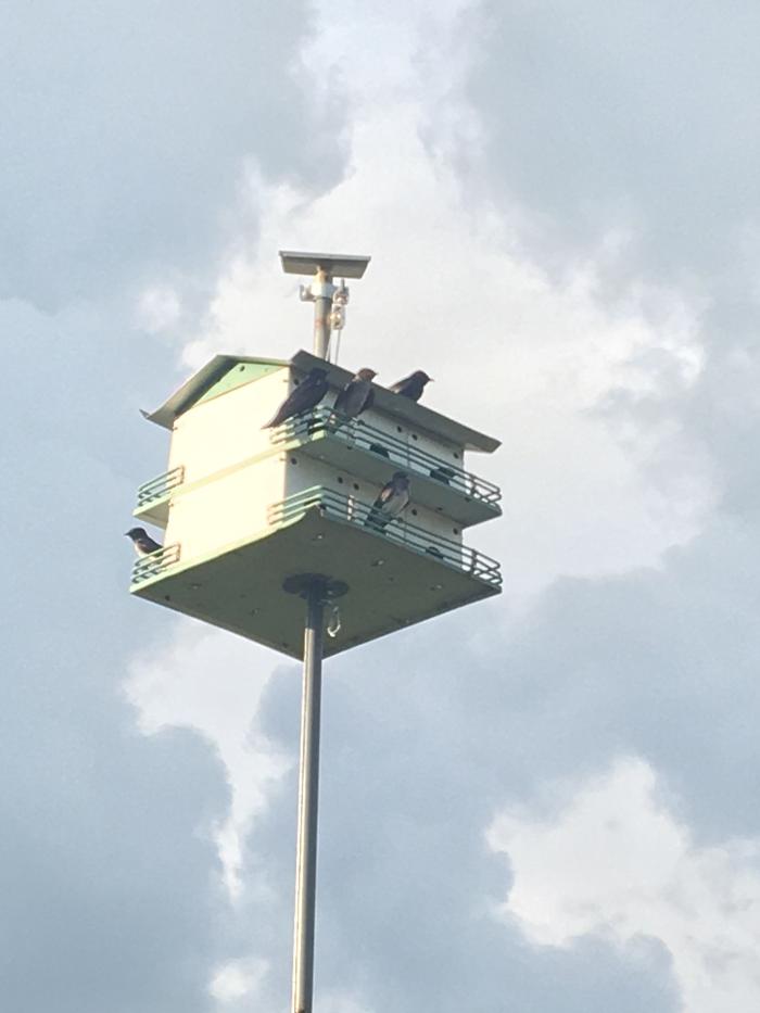 We've got 8-9 Martins that have decided to make our yard their home; three nesting pairs, and some other sub-adults who are practicing their nest building but not laying eggs yet.