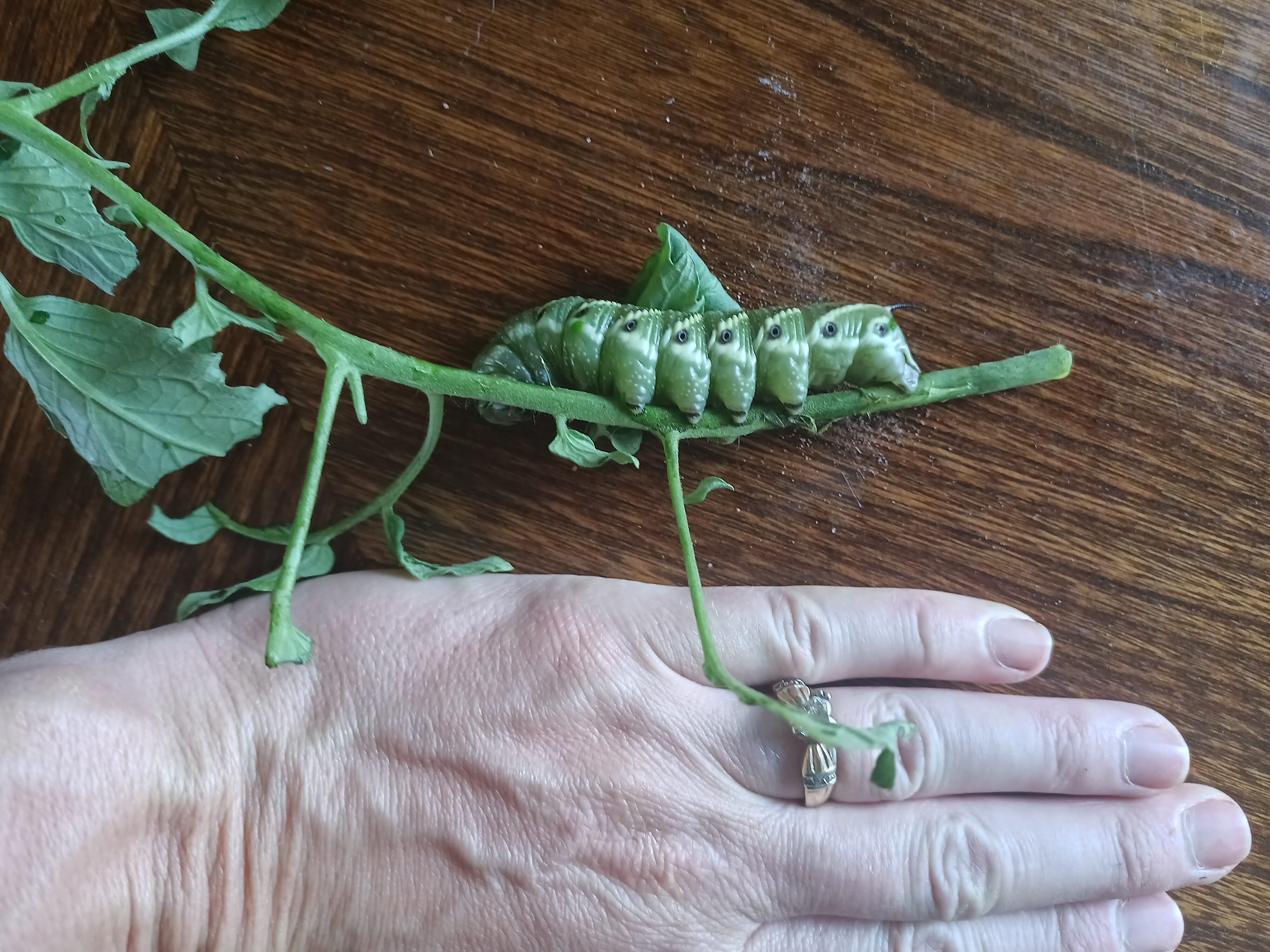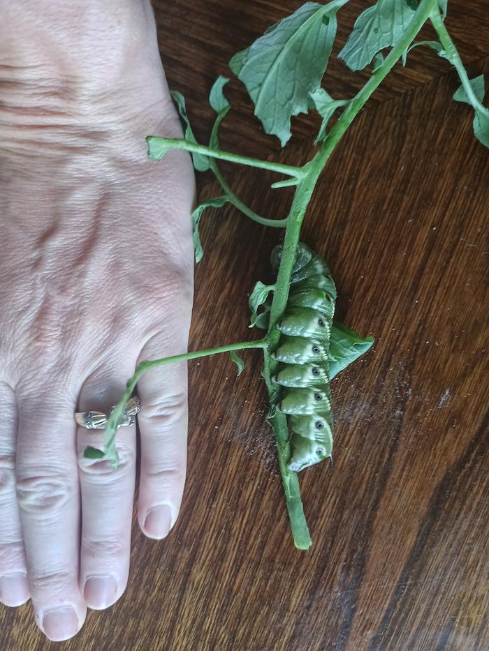 elle sagenev wrote:Another first was when I went into the greenhouse to discover we had tomato hornworms. No one I know has ever seen them before. My kids loved them.