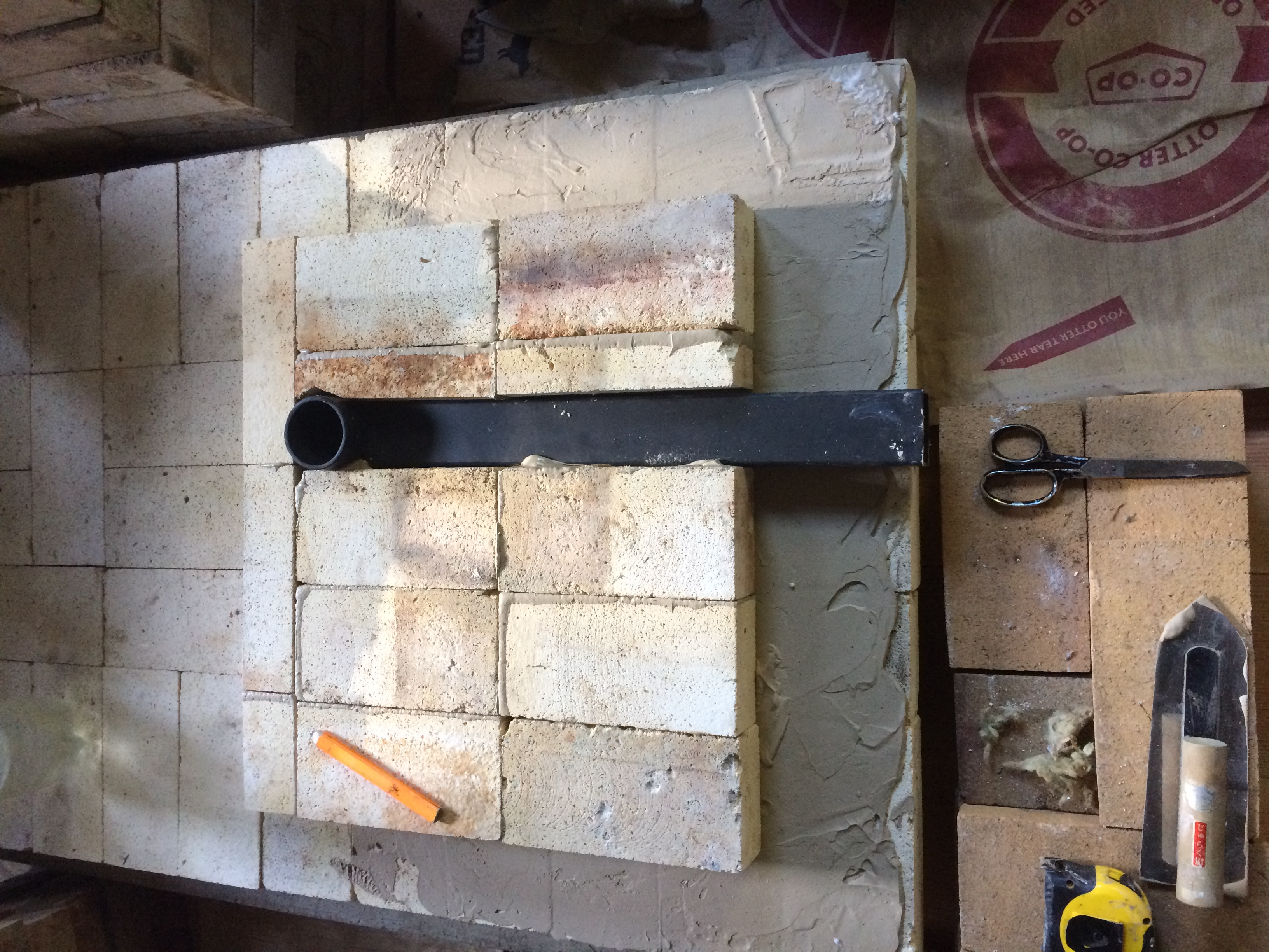 I made a chimney exit which is an experiment. The chimney sits on two IFB on end with some superwool. The chimney is about 7 1/2" from the floor of the stove.